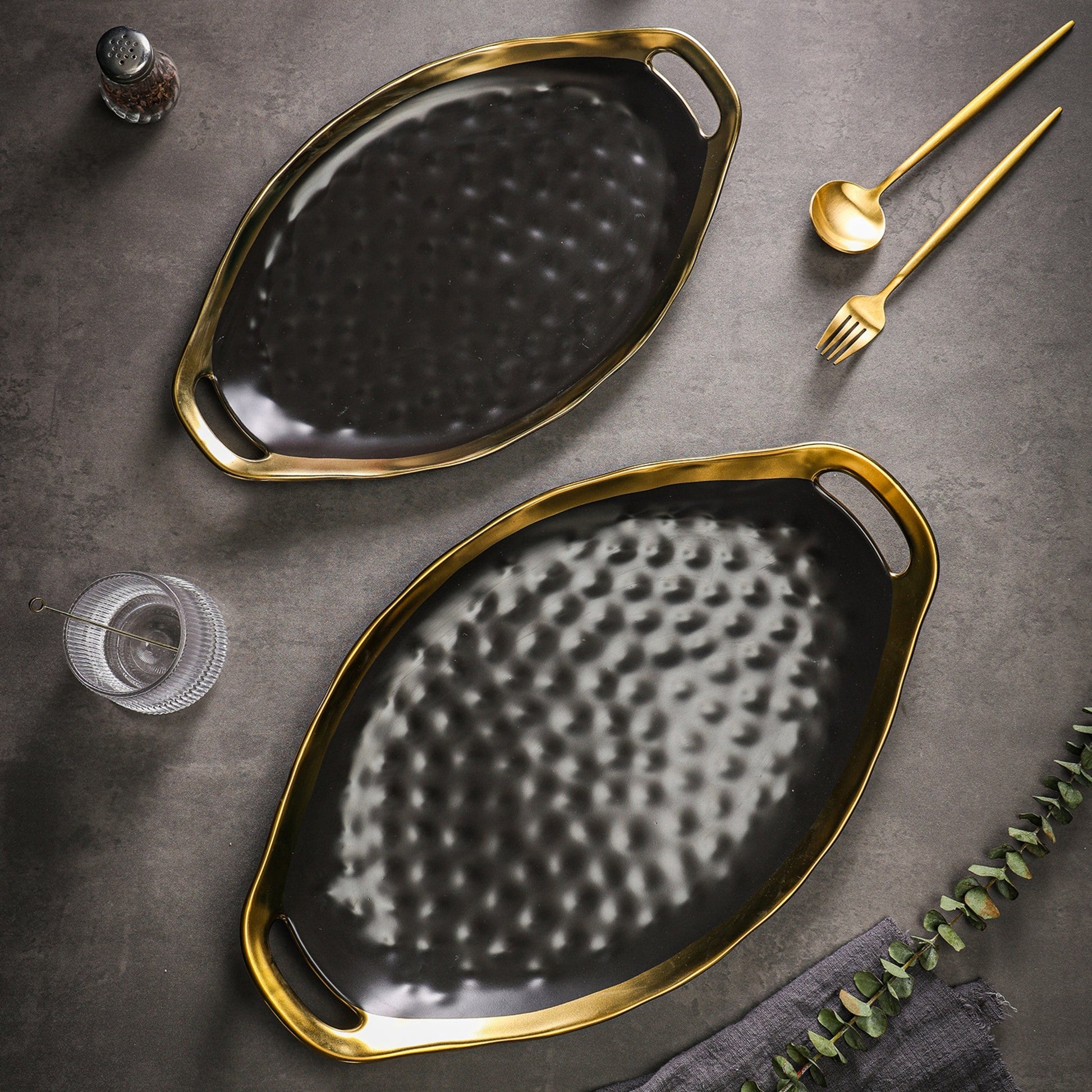 Make your guests say, “wow” with the Stone Lain Florian Porcelain oval serving plate set with handles. Pair it with our best-selling Florian dinnerware set to complete the look, or let it be the star of a more simple table setting–either way, the gold trim and thumbprint pattern make an elegant statement. The set comes with two pieces, a medium and a large.