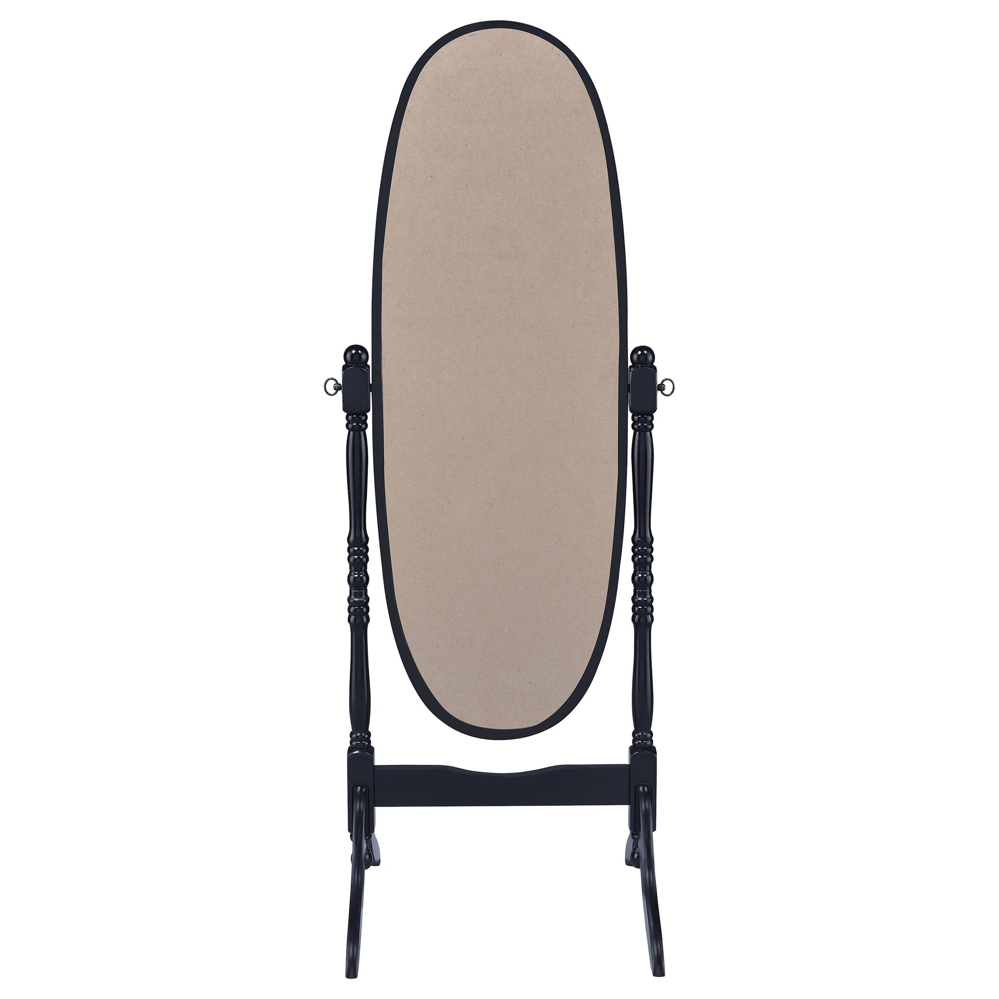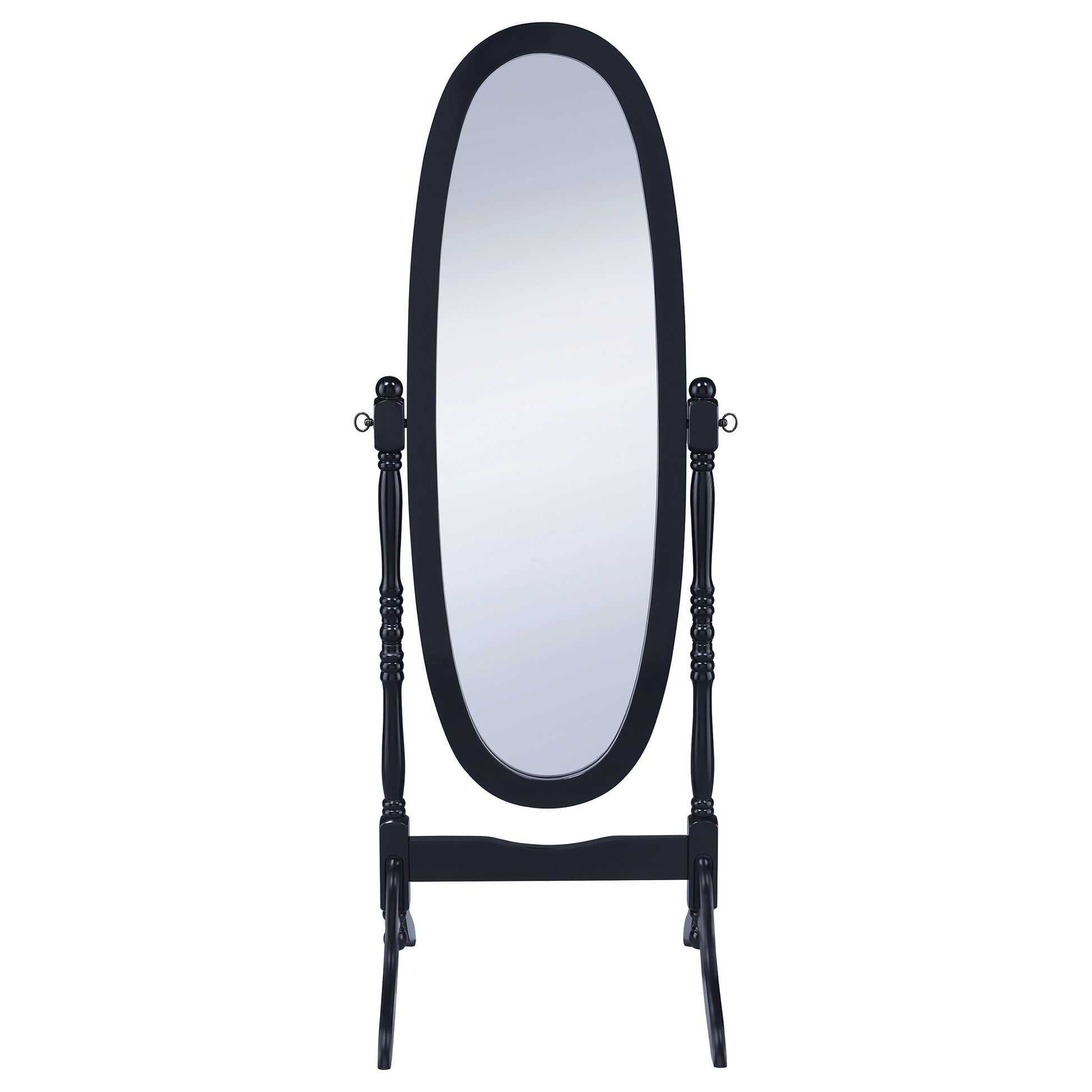 Cheval mirror combines full-length reflection with a classic freestanding silhouette for everyday dressing and room-to-room versatility. Hardwood, engineered wood, and mirrored glass form a sturdy oval frame set on a supportive base that pivots for adjustable viewing angles. Curved legs add traditional character while keeping the overall look light and graceful. Its black finish offers contrast and definition, making it a practical fit for bedrooms, dressing areas, and entry spaces where full-length reflection is useful.