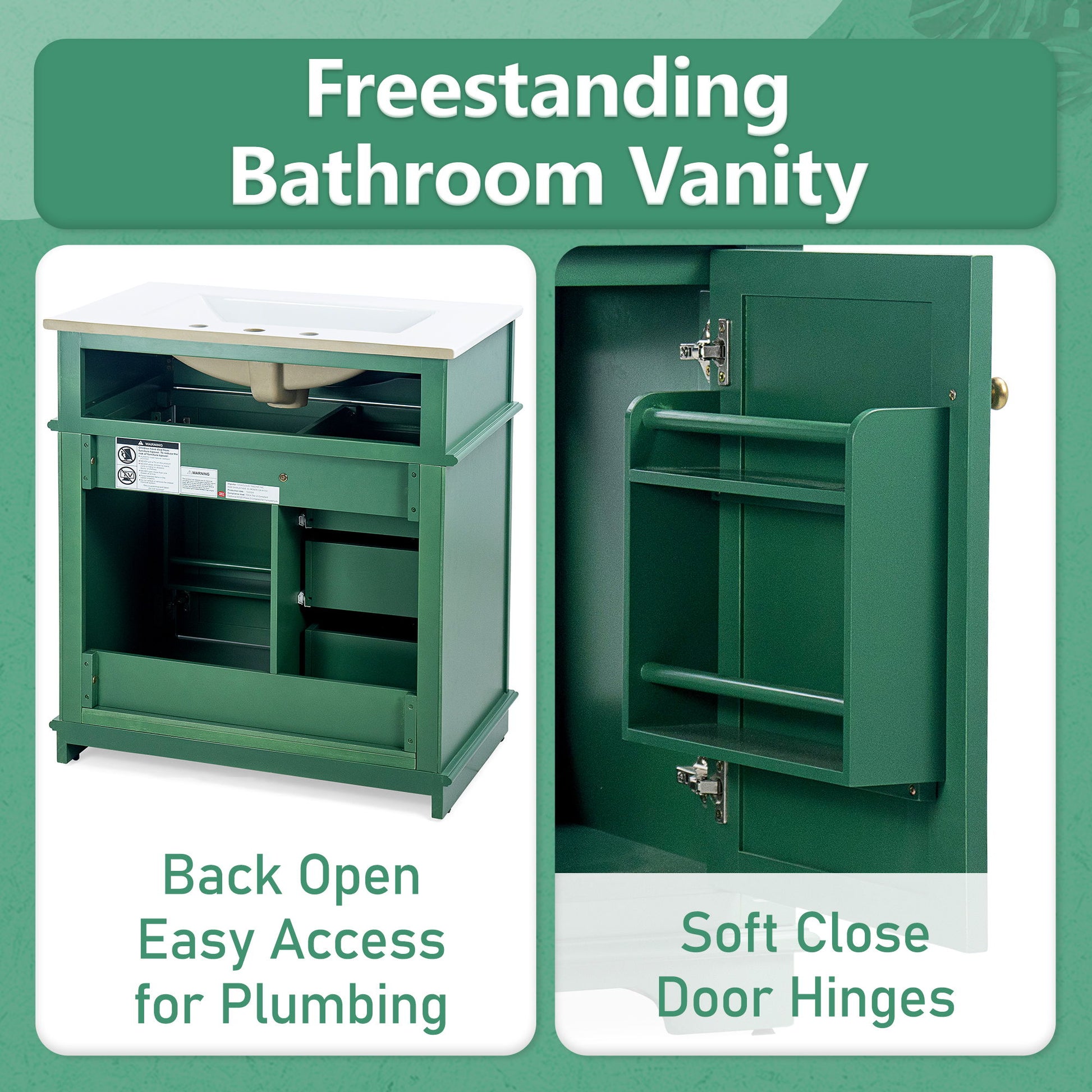 30" Bathroom Vanity With Sink, 1 Tip Out Drawer, 3 Drawers, Door Shelf, Soft Closing Door - Green