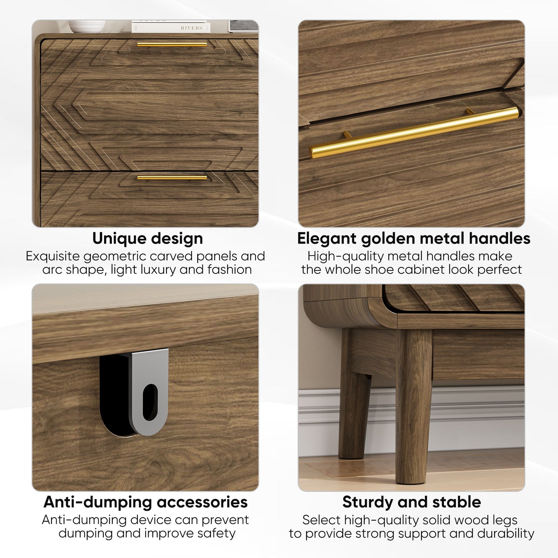 - Farmhouse Design: Geometric carved panel and gold handles add elegant texture and visual interest to any space