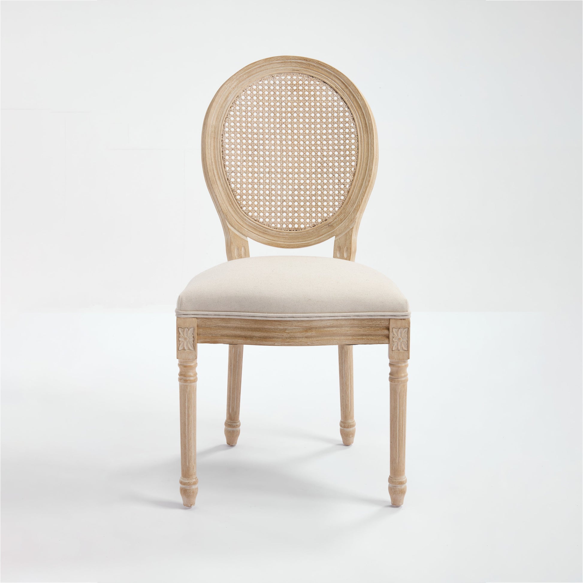 This set of 2 French Country dining chairs features beige cotton linen upholstery and a natural rattan backrest, ideal for enhancing dining rooms, kitchens, or restaurant seating with a classic and comfortable style.