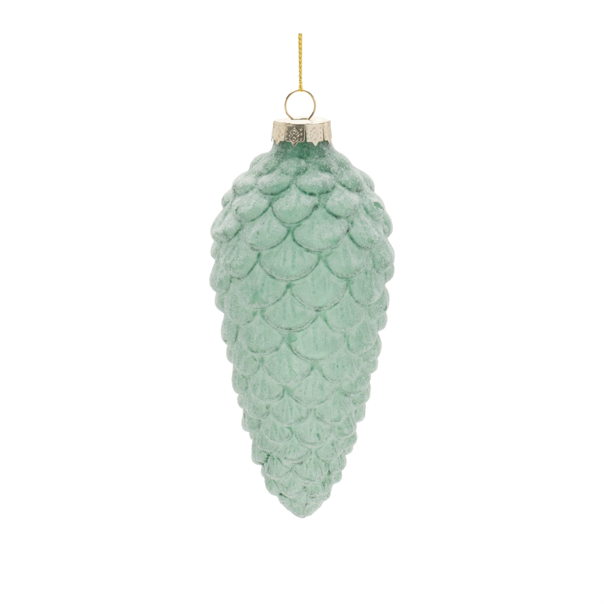 Bring a touch of winter’s charm to your holiday decor with this set of six Frosted Green Glass Pinecone Ornaments. Featuring delicate wintry green tones and a frosted glass finish, these ornaments capture the essence of a snowy woodland scene. Their rustic pinecone shapes add a natural, festive touch to any Christmas tree, wreath, or garland. Each ornament is finished with a silver cap and a delicate string hanger for effortless decorating.