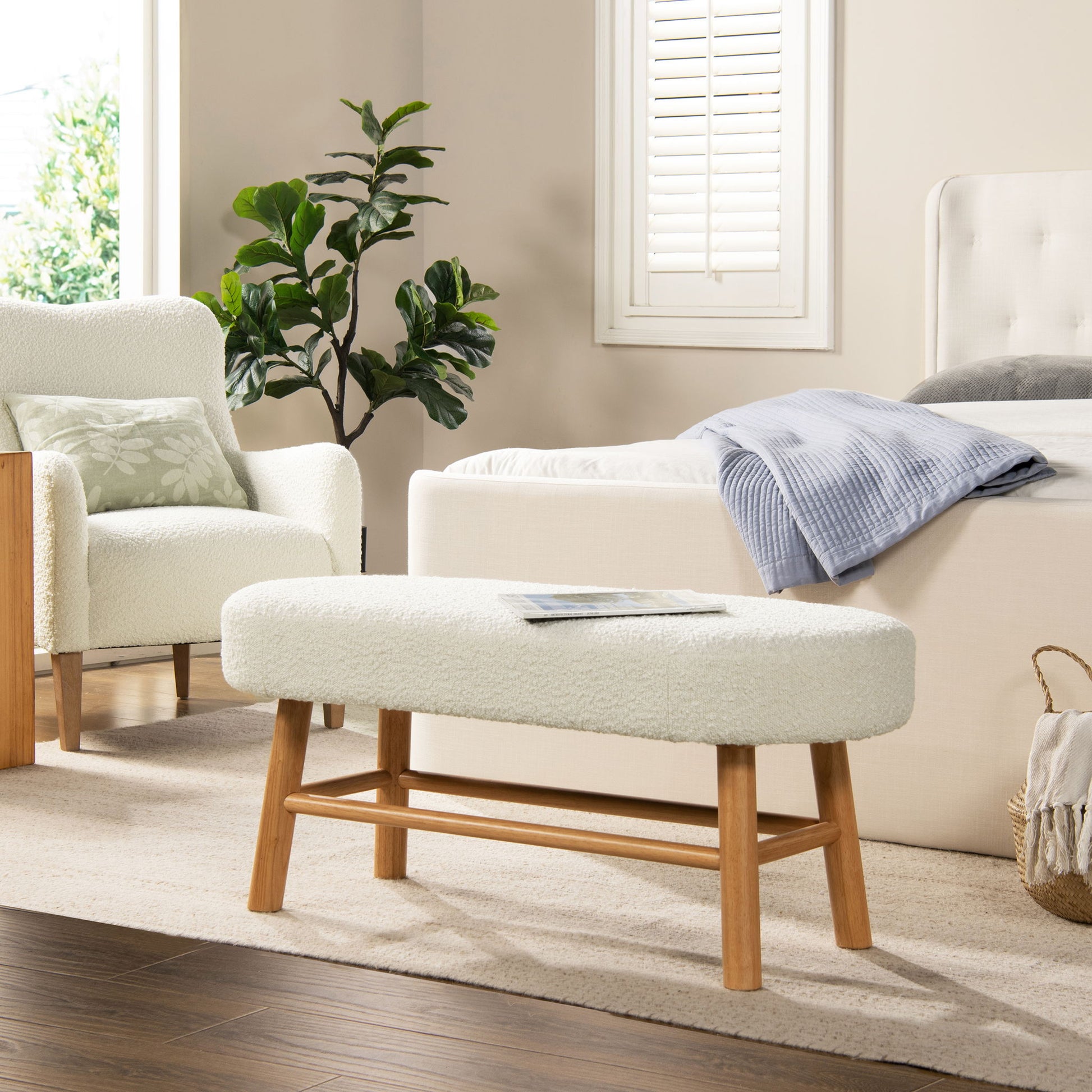 Fuji - Upholstered Bedroom Accent Bench With Natural Legs - Ivory White