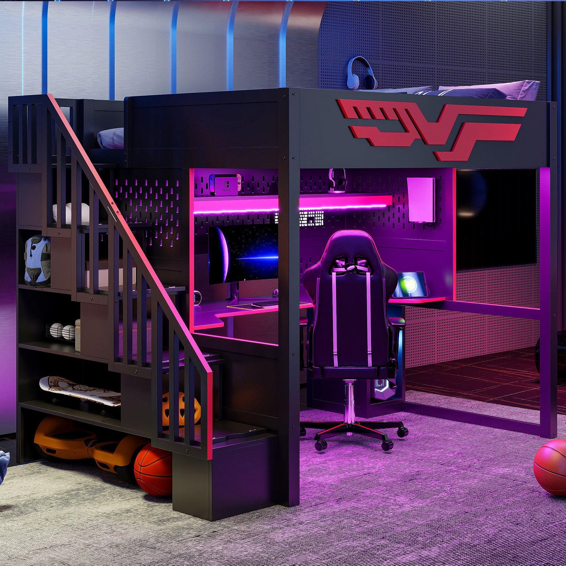 Full Gaming Loft Bed With Desk And Storage Staircase, LED Lights And USB - Red / Black