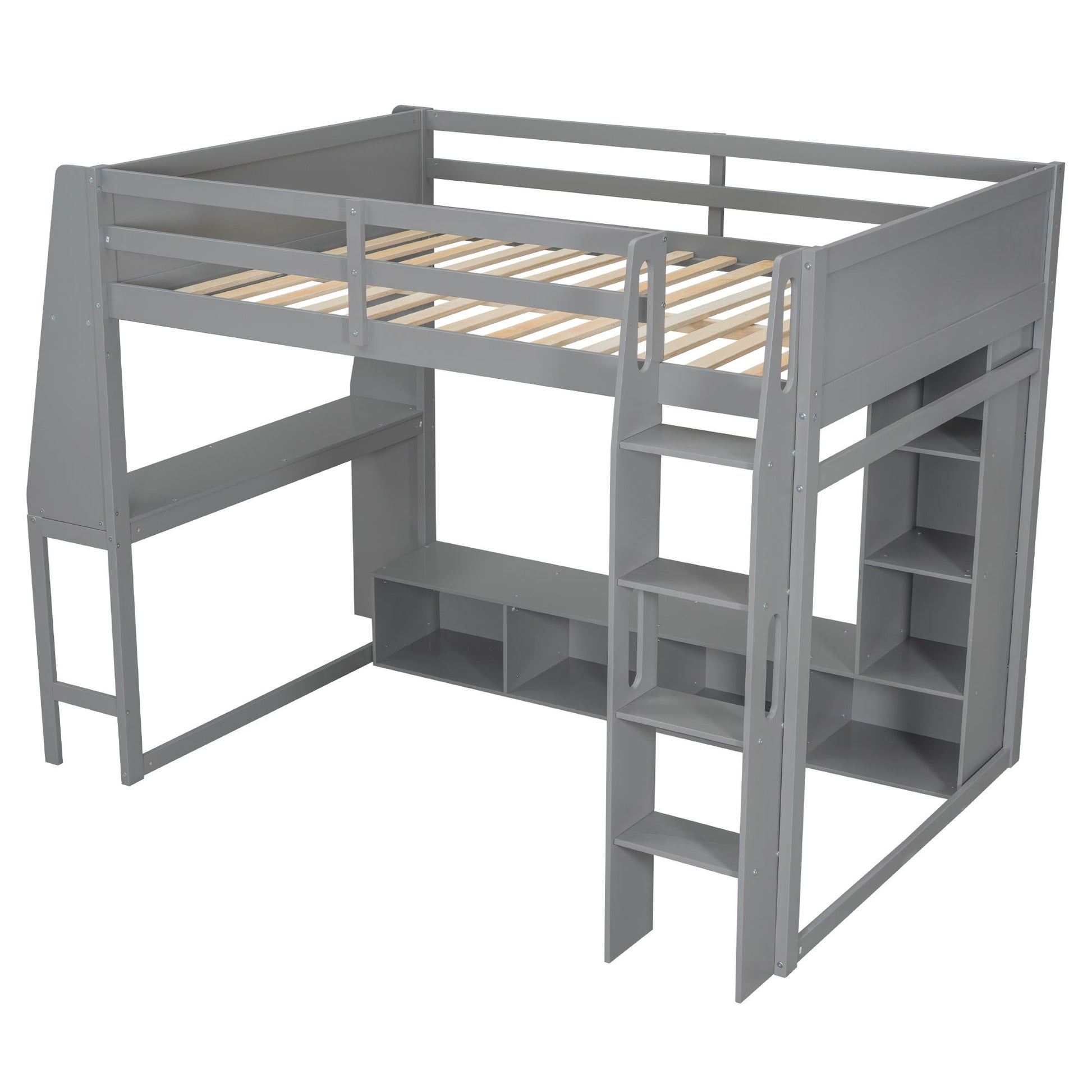 Full Size Gaming Loft Bed With Desk, Multi Storage Shelves, LED Lighting, And Hanging Clothes Rack - Gray