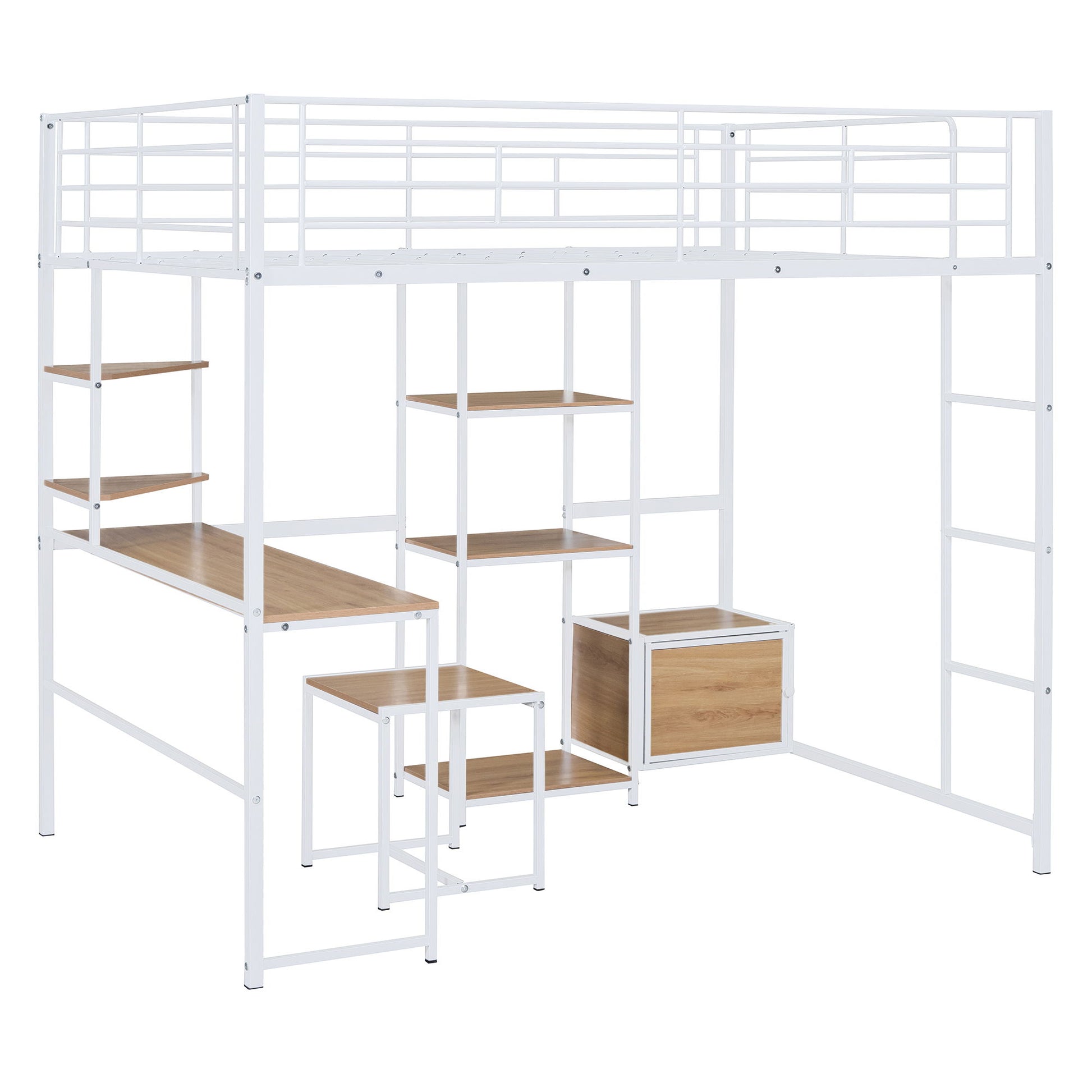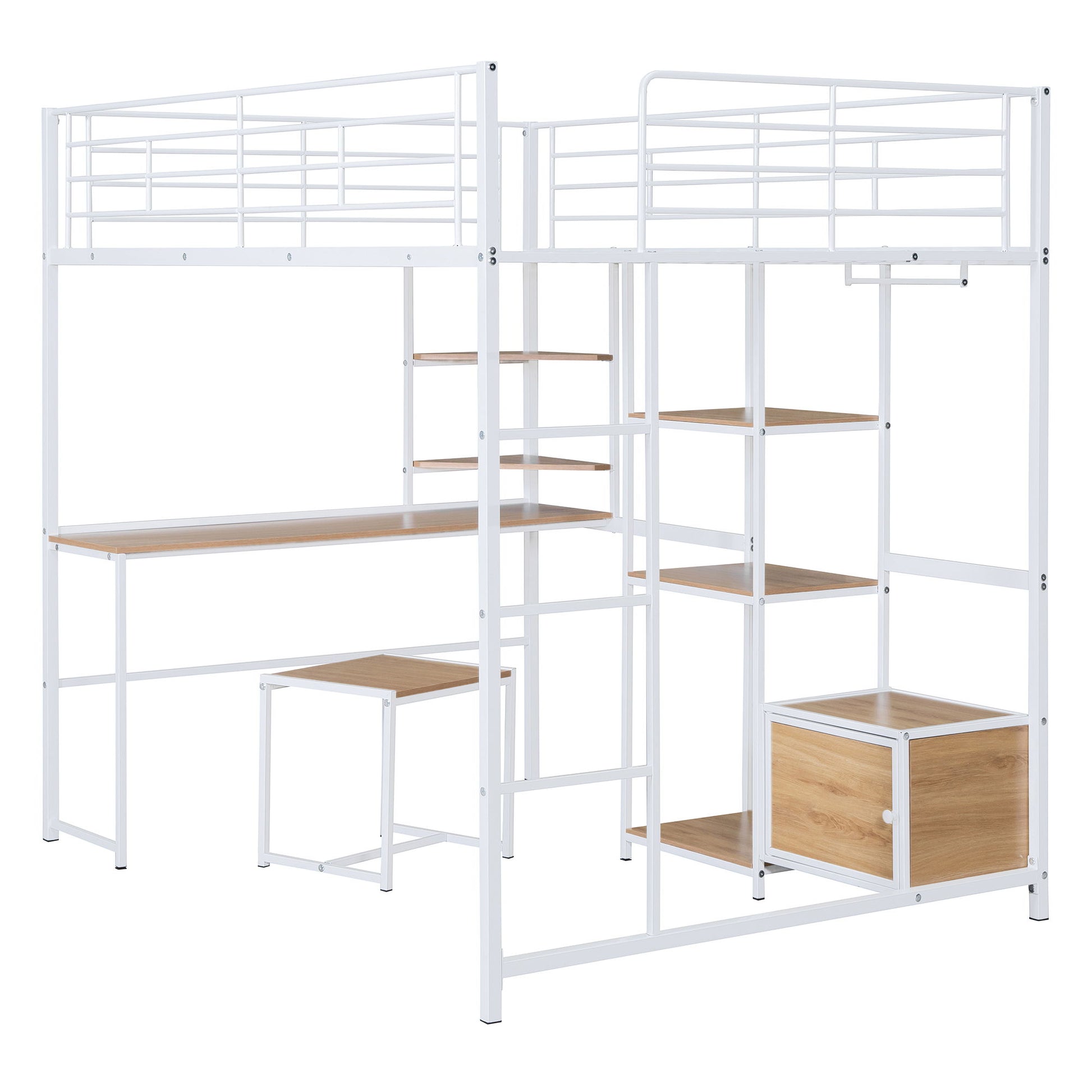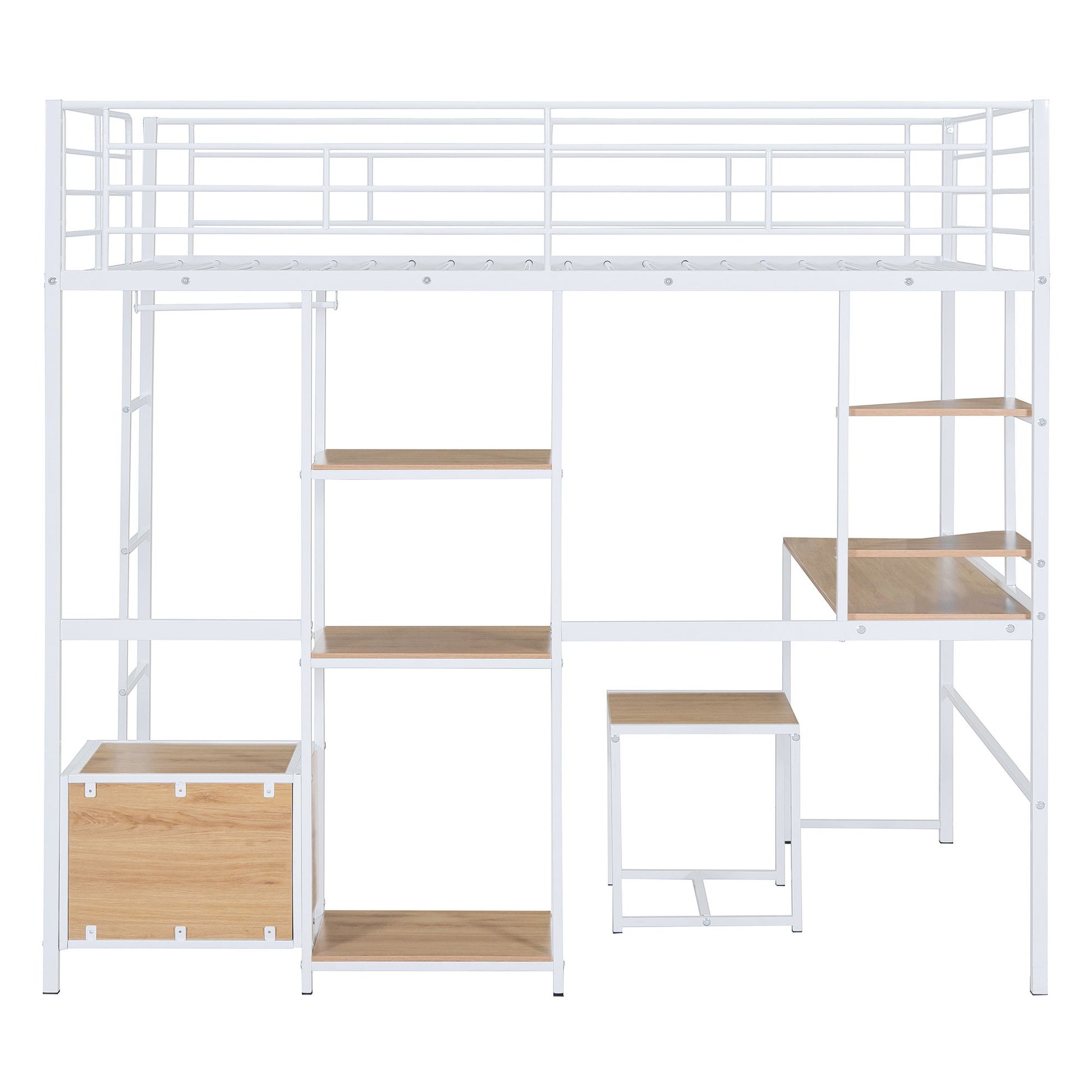 Full Size Loft Bed With Desk And Stool, With Open Style Wardrobe, Shelves And Cabinet - White