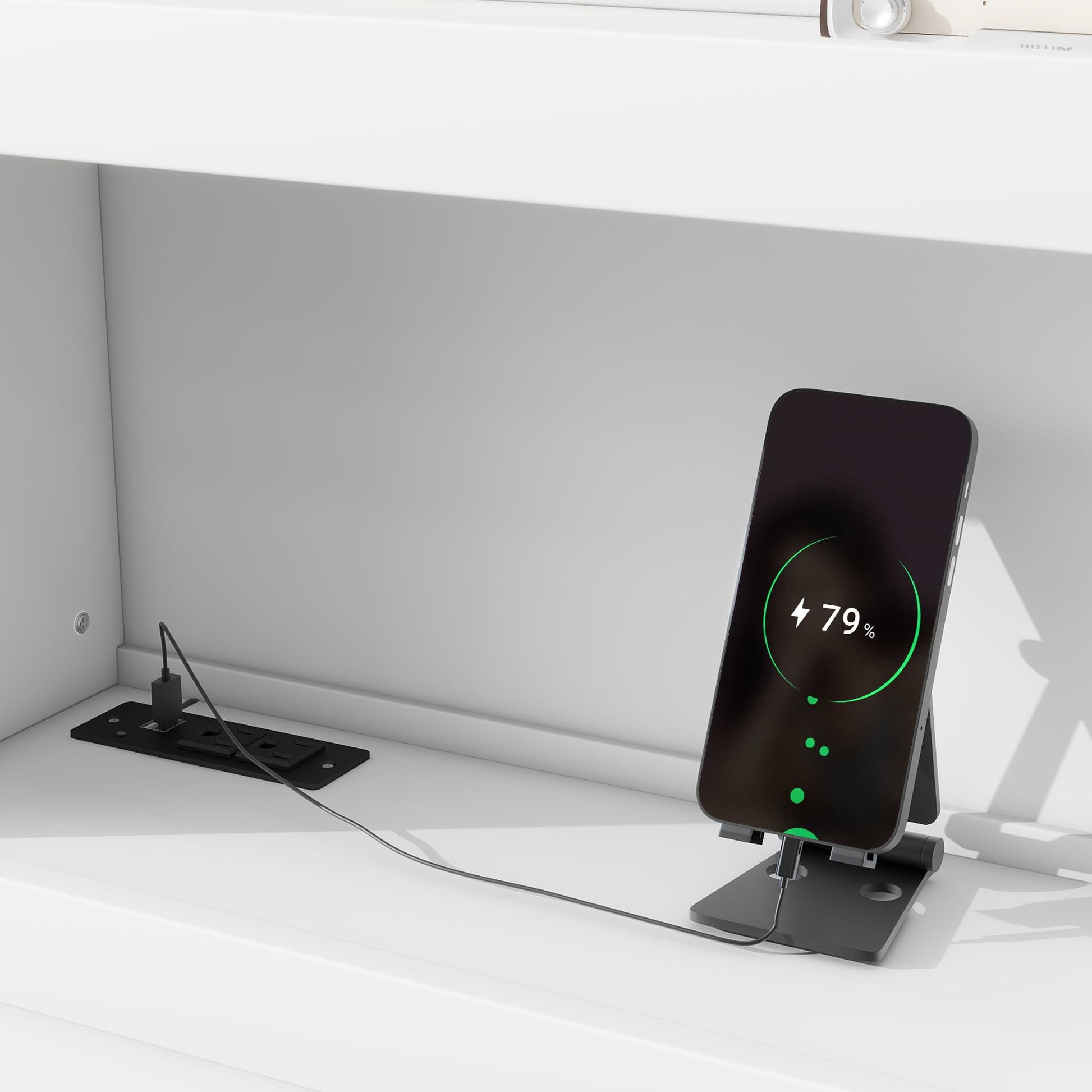 Full Size Platform Bed With Trundle, Drawers, USB Ports And Built In Shelves - White