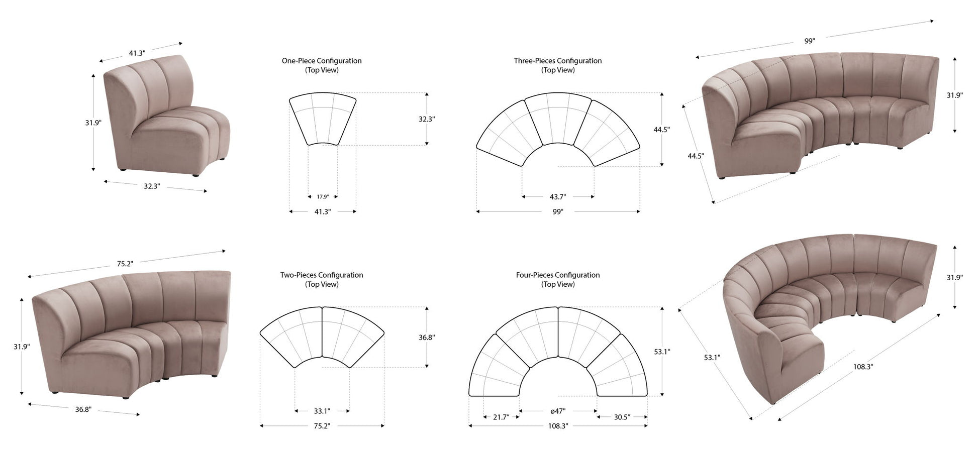 Introducing the Garbi Modular Sectional, a revolution in seating versatility and style. Crafted with a sturdy wood frame and adorned with sumptuous velvet seats and backs, this sectional exudes both modern flair and deco elegance. Its modular design allows the pieces to combine effortlessly, creating either a circular or crescent-shaped seating arrangement reminiscent of banquet-style gatherings. Whether arranged for intimate conversations or grand social events, the Garbi Modular Sectional adds sophistication and luxury to any space. Embrace its innovative design and opulent materials, making it the centerpiece of your contemporary or deco-inspired decor.