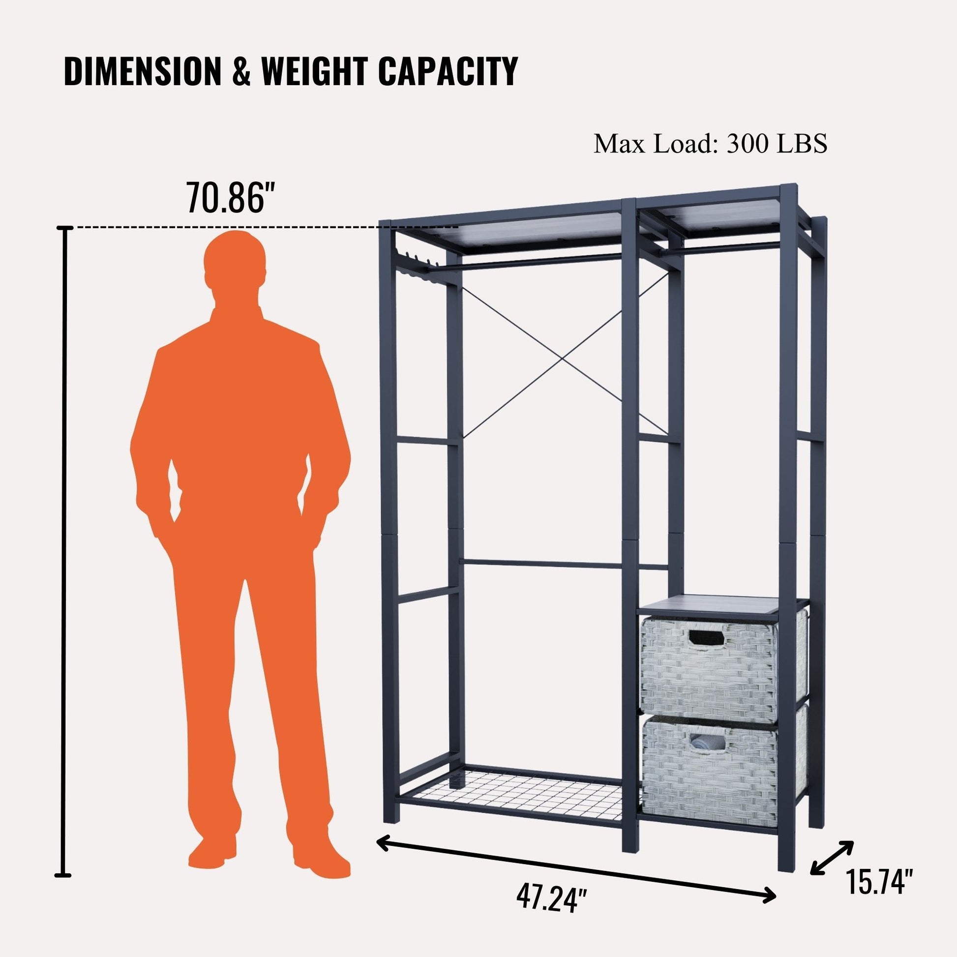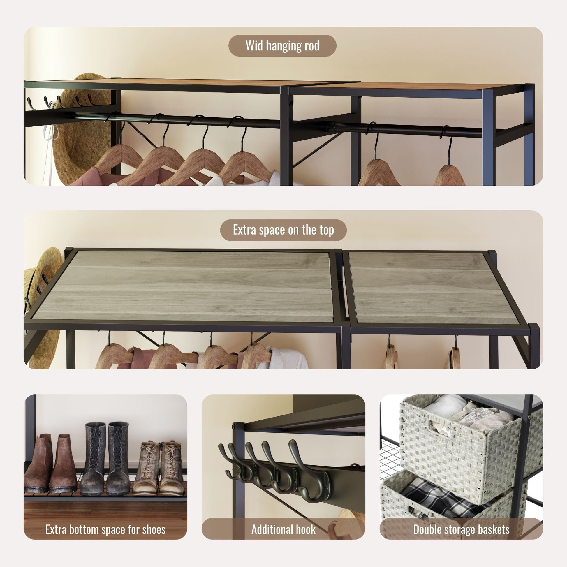 - Elegant & Functional: This freestanding clothes rack creates extra storage in small spaces effortlessly.