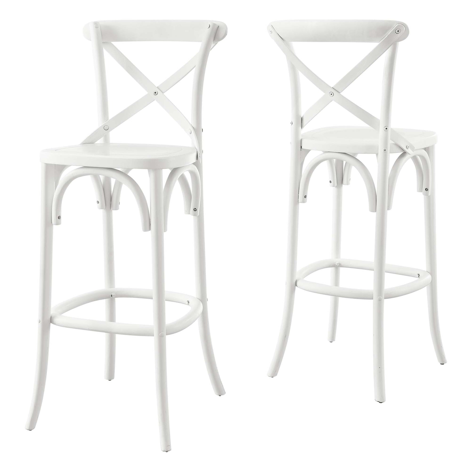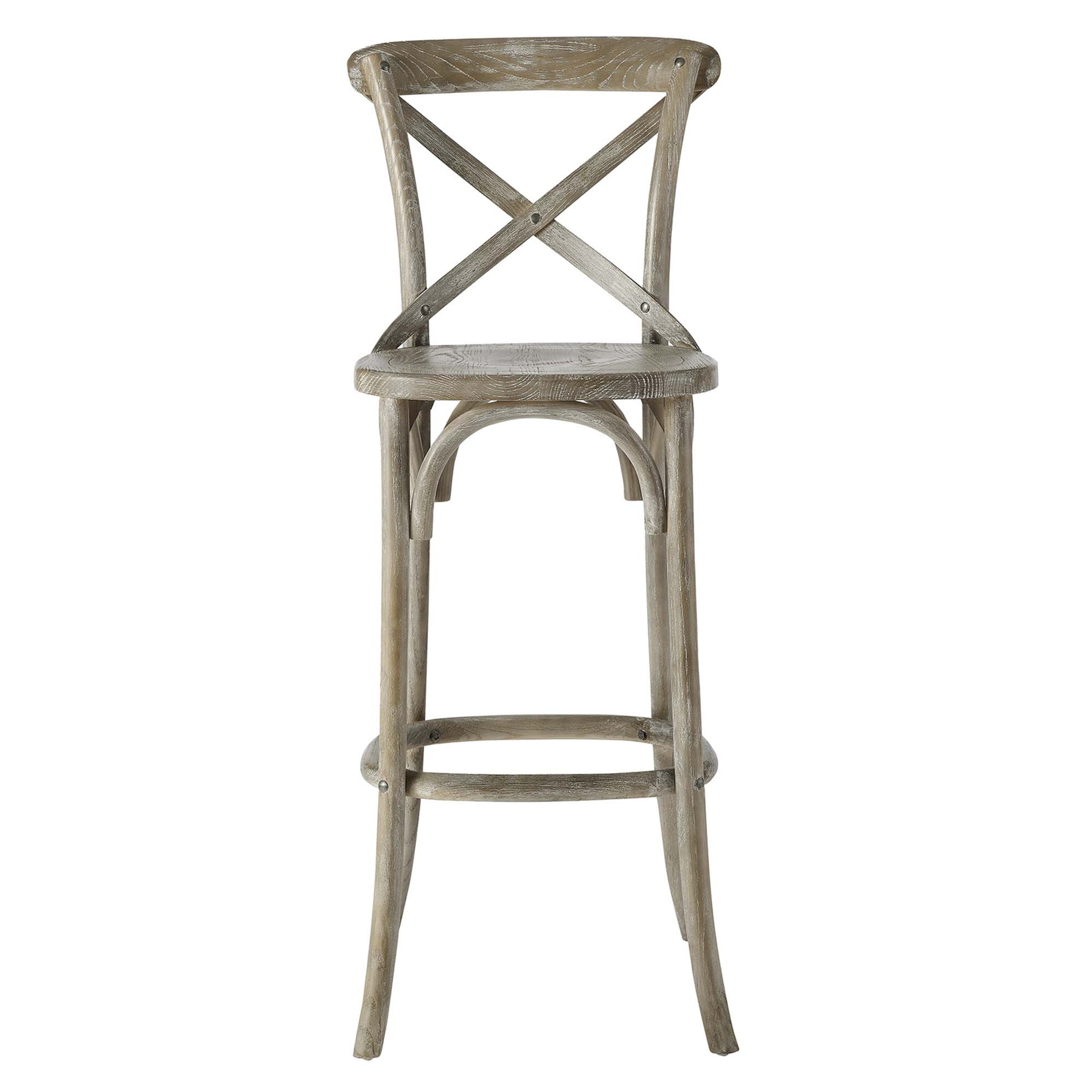 Introduce feelings of nostalgia as you gather around the kitchen counter for a quick breakfast or dinner with friends with the Gear Bar Stool. Blending farmhouse charm with modern style, this bar-height stool features an X-brace back and stretchers between splayed legs. With non-marking foot caps to protect flooring, this bar stool is durably crafted with durable elm wood for a sturdy construction built to last. Make a statement in your dining space or kitchen area with this versatile wood bar stool. Weight Capacity: 330 lbs.
