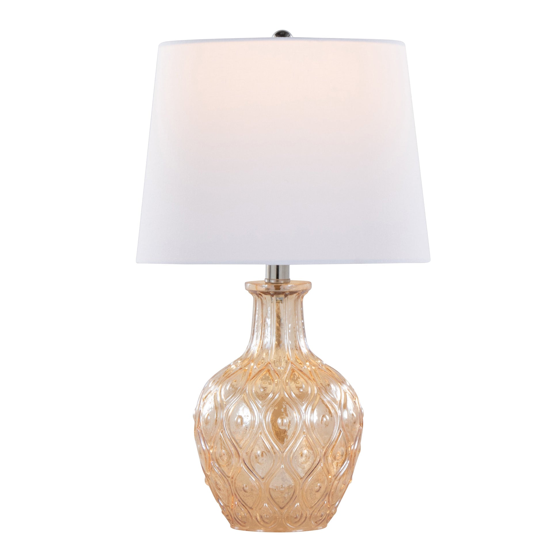 - Sleek jug-shaped glass base complemented by a white linen drum shade