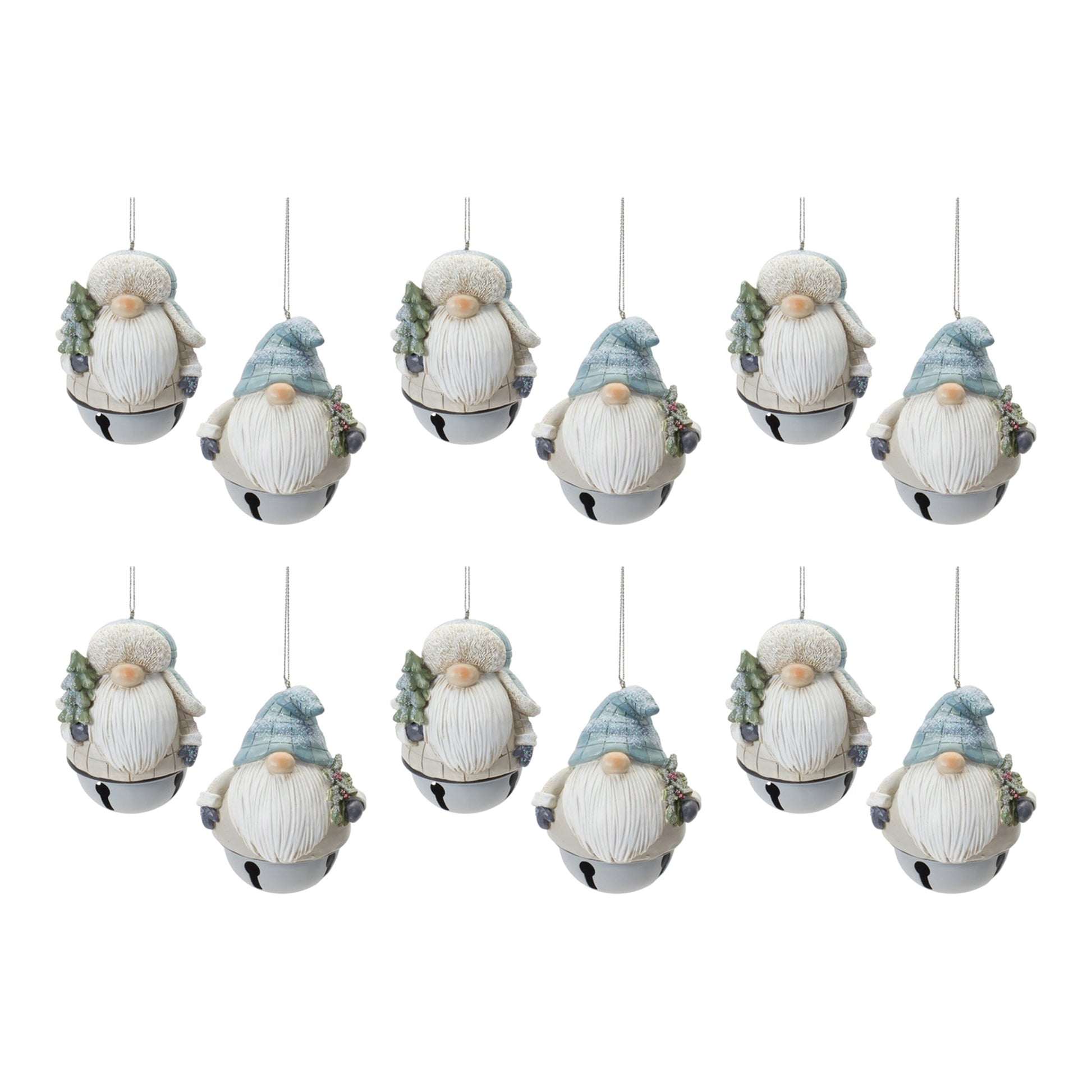 Add a whimsical touch to your Christmas Tree with this beautiful set of Gnome Sleigh Bell Ornaments. Featuring 12 pieces and 2 assorted designs, this set's wintry blue and grey tones, whimsical gnome character design, glitter frosted finish, and sleigh bell bottom accent is the perfect combination to create a memorable display. The quality polyresin and stone powder composition with delicate silver string hanger is sure to endure for seasons to come. Whether you're adding a touch of cheer to your home or gifting to a loved one, these ornaments will definitely bring smiles to your home.