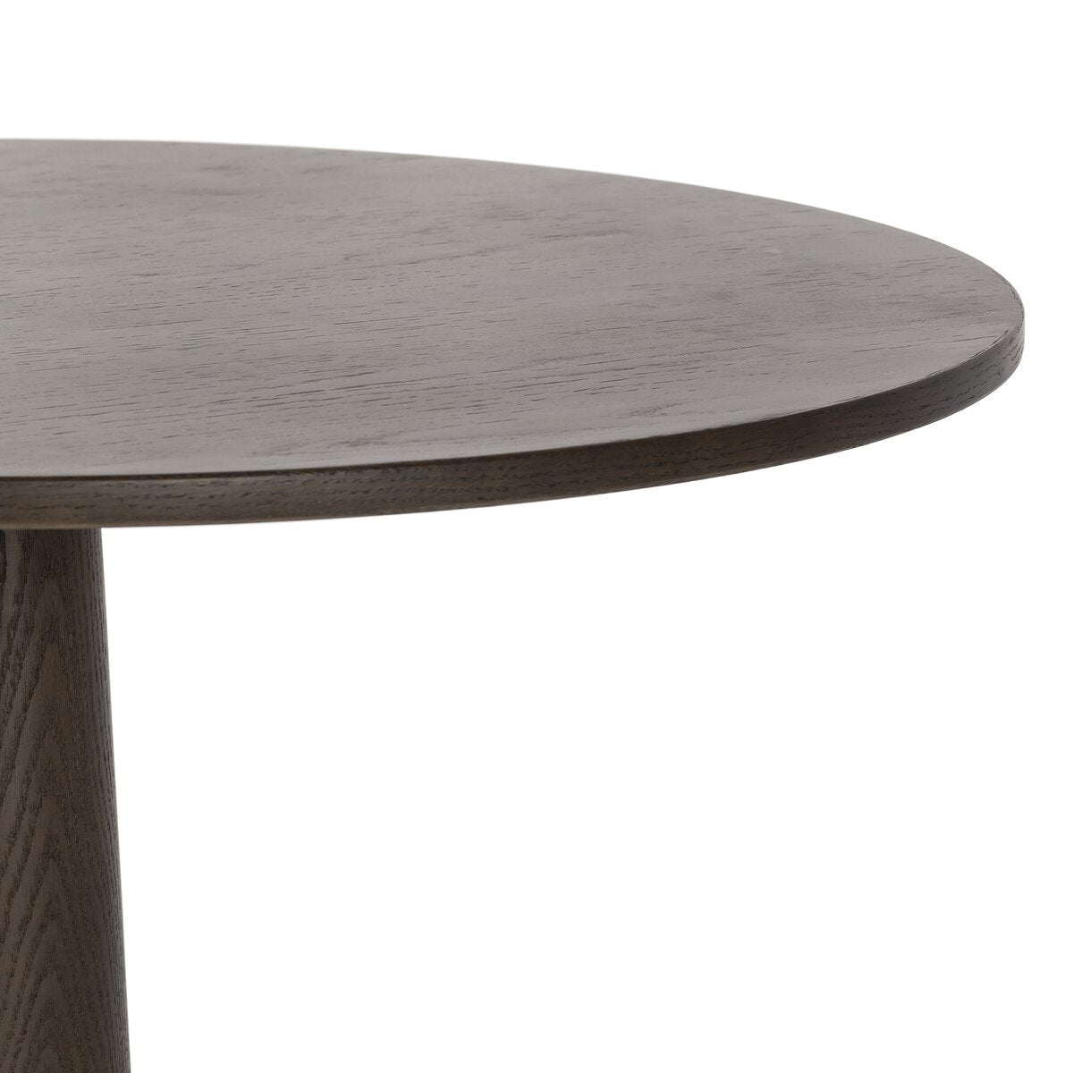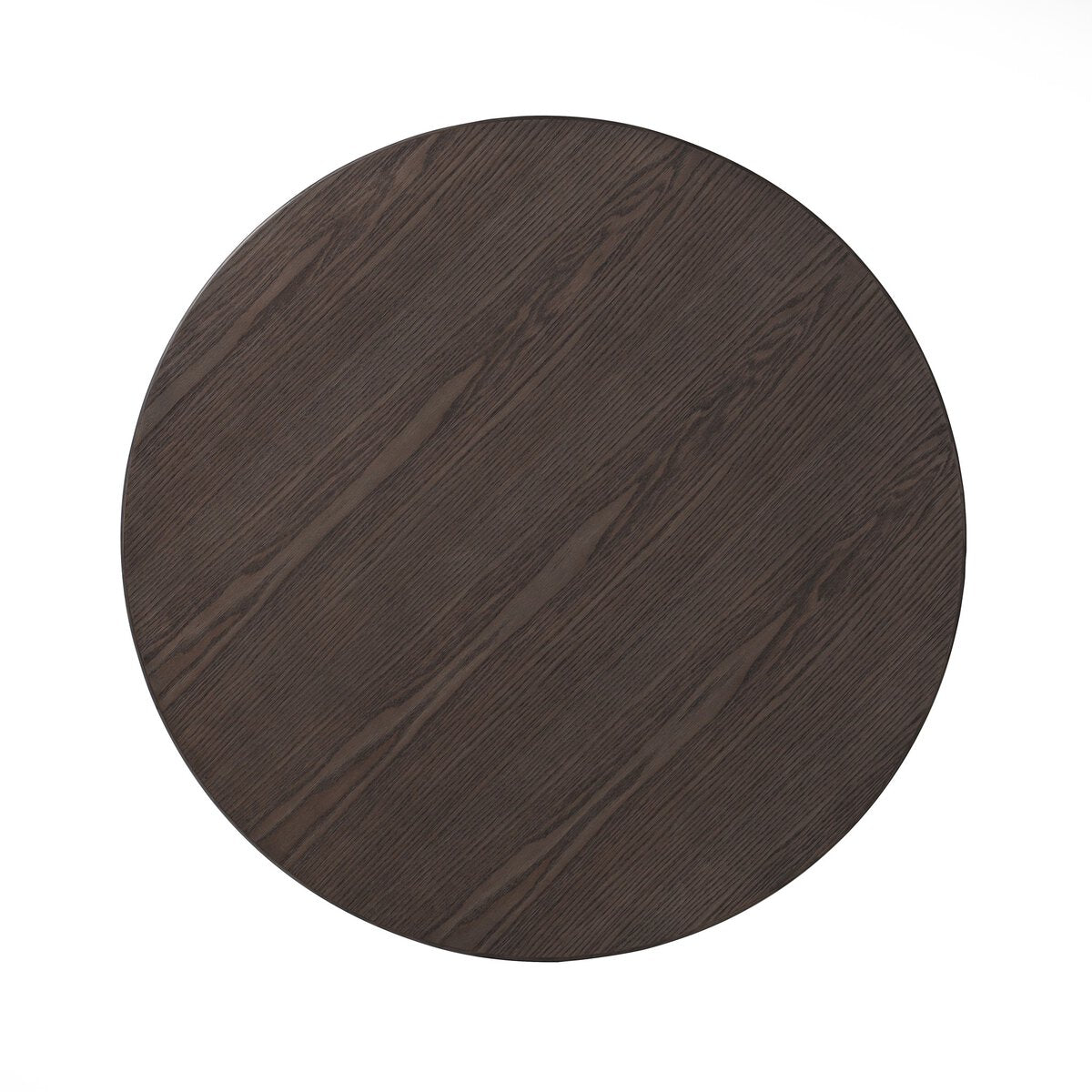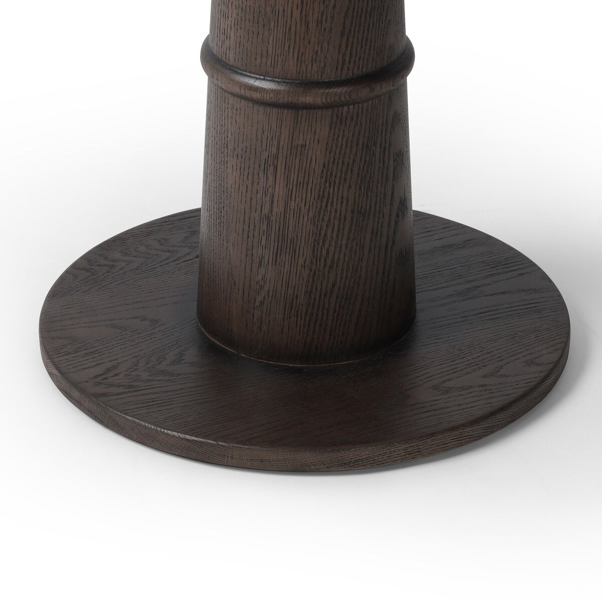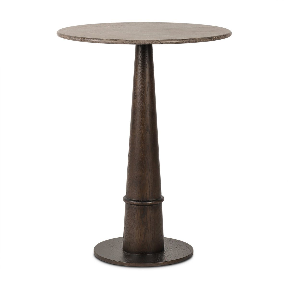 Designed at bar and counter height, this compact round table offers a refined surface for casual meals, cocktails, or intimate gatherings. The pairing of natural materials creates visual balance, while the streamlined pedestal base keeps the look open and uncluttered.