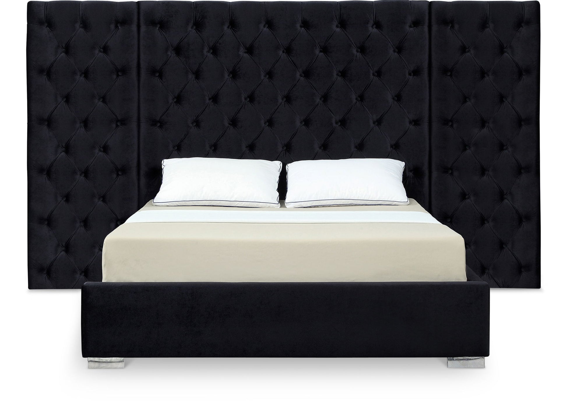 Rejuvenate your bedroom space with this Grande Bed. Svelte velvet covers each inch of this magnificently styled bed, lending it a bit of softness and glamour. The bold headboard is heavily button tufted for a regal and sophisticated look, and it's padded, so you can rest your back against it while you read or watch TV. The full-framed base is modish and sleek and provides sturdy support for the mattress of your choice.