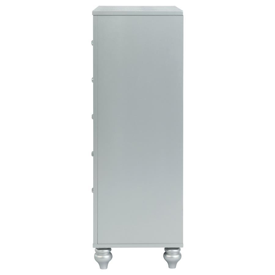 Enhance your home with a modern glam update to a classic design with this transitional five-drawer chest. It boasts a dazzling design that takes lends glitz to any modern bedroom. It comes in a vibrant silver metallic finish with fret work detail on the front panels and drawer fronts. The drawers are adorned with crystal-like pulls and the top ones are lined with black felt to protect treasured valuables. Delicate bun feet complete the design of this exquisite masterpiece.