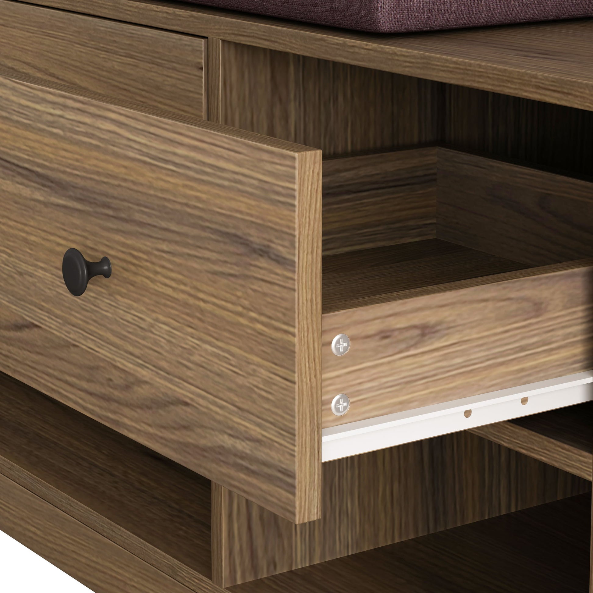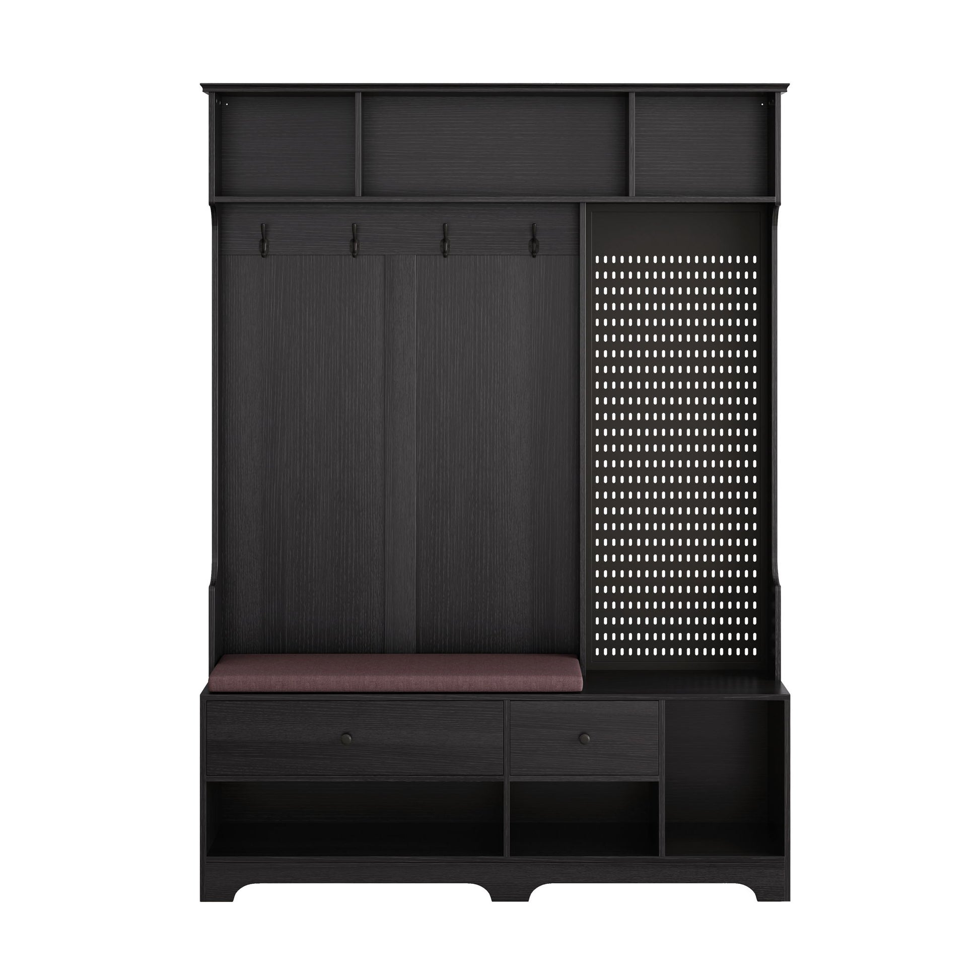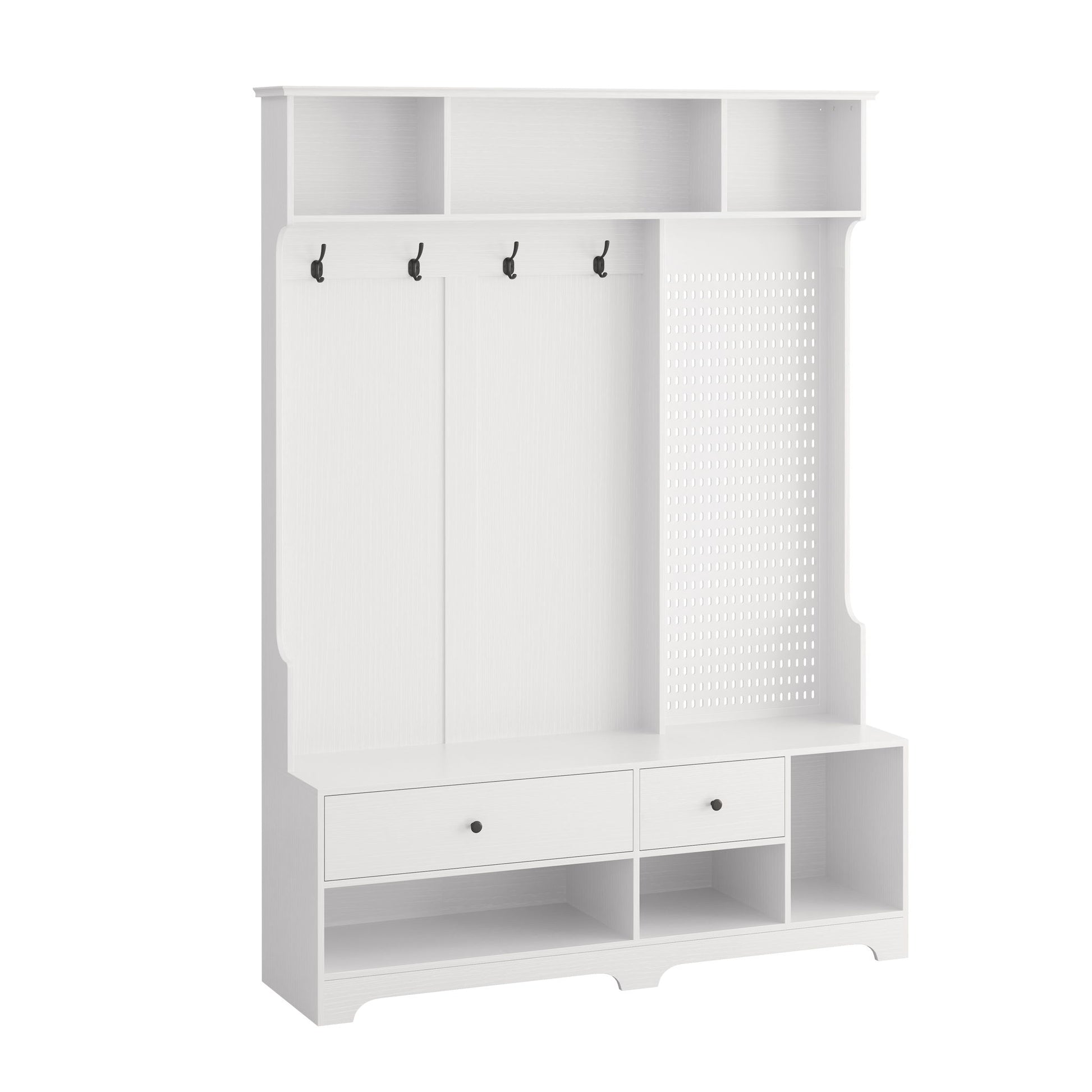 - All-in-One Organization: Combines a seat, coat rack, drawers, shelves, and pegboard into one compact unit for efficient entryway management.