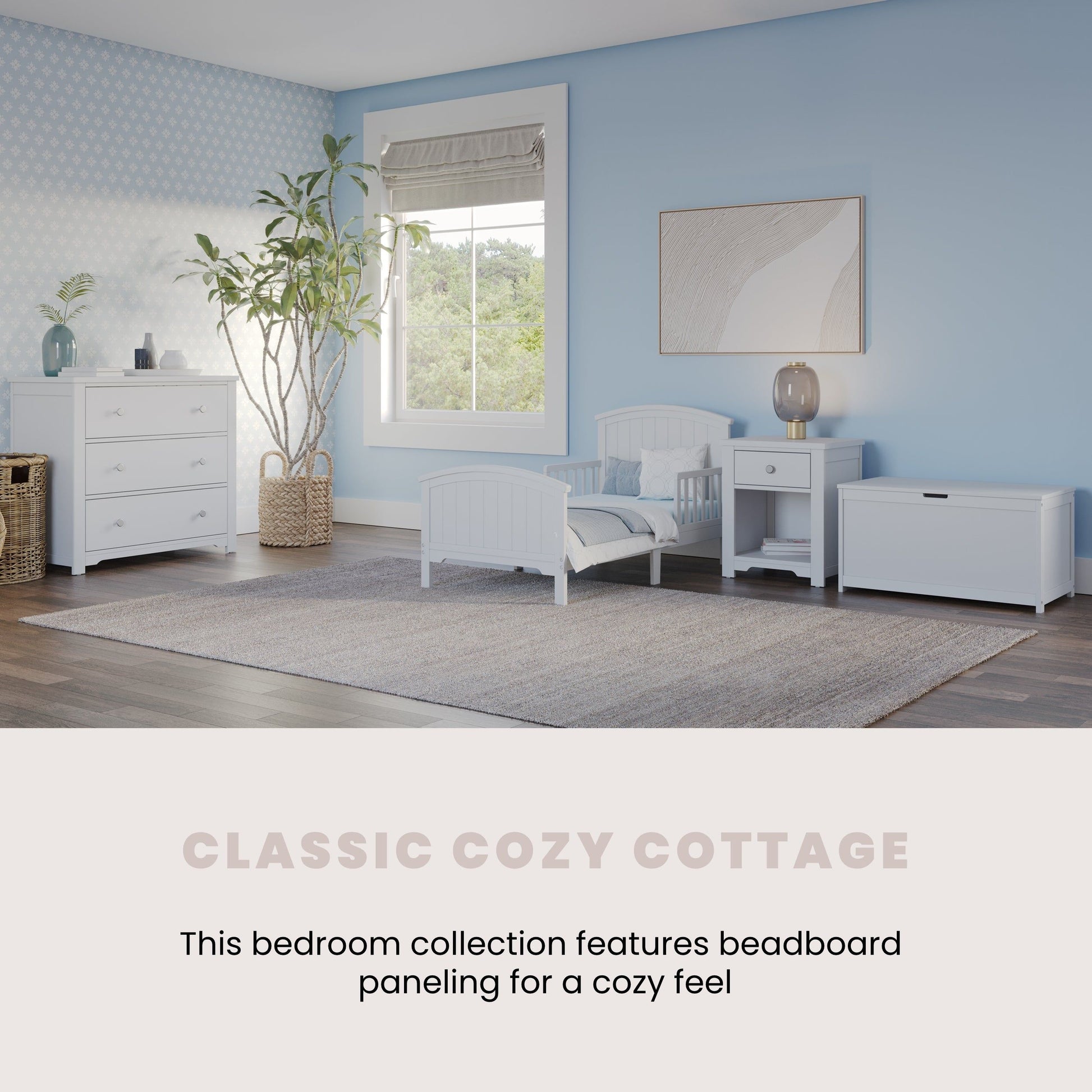 Constructed from high-quality pine and pine veneers, the Hampton toddler bed emphasizes durability without compromising on elegance. The wood slat support system enhances mattress longevity and comfort, allowing for restful nights. Available in four non-toxic, baby-safe finishes, this bed not only enriches your child's space with its visual impact but also prioritizes safety and sustainability, meeting ASTM and CPSC standards for added reassurance that every detail has been carefully considered.