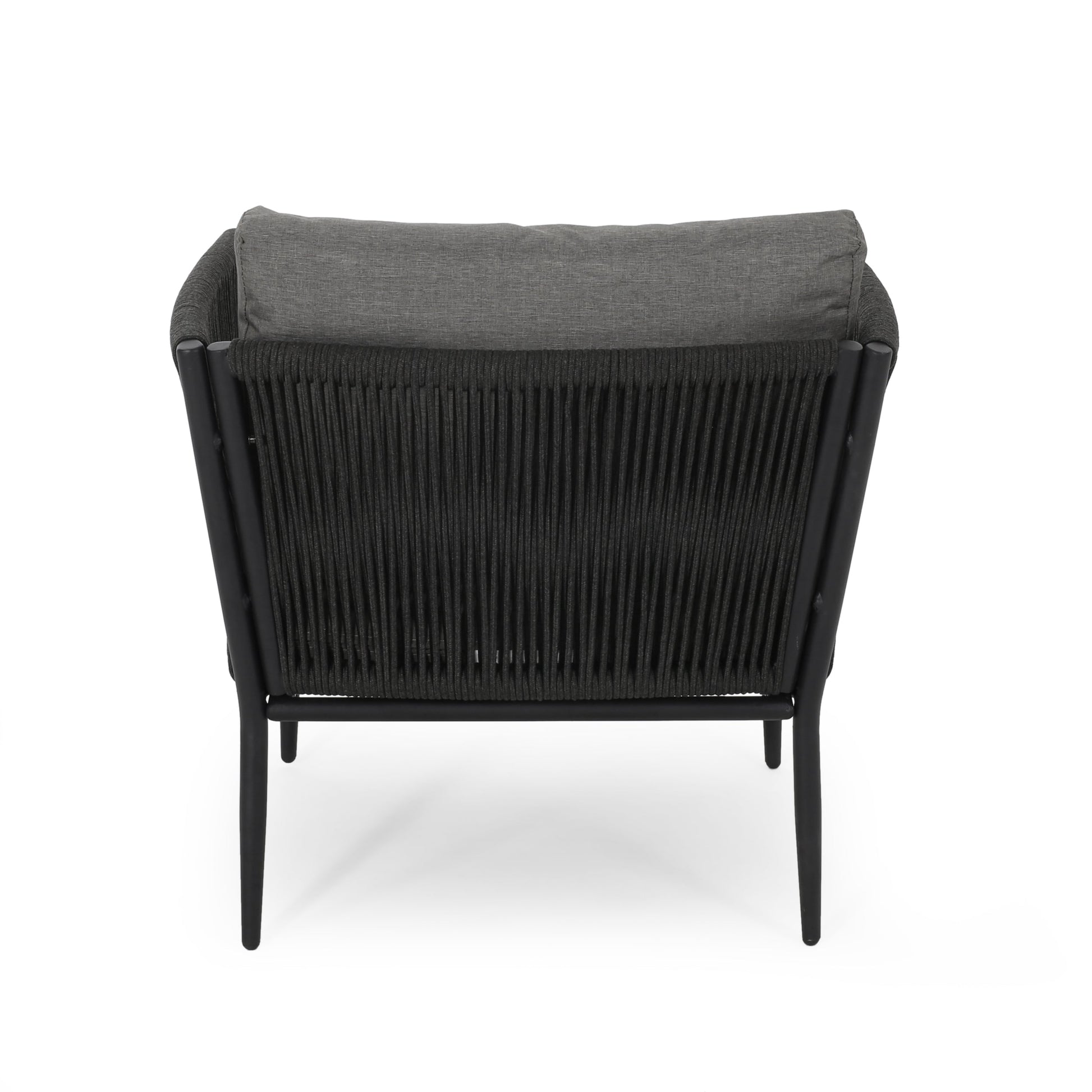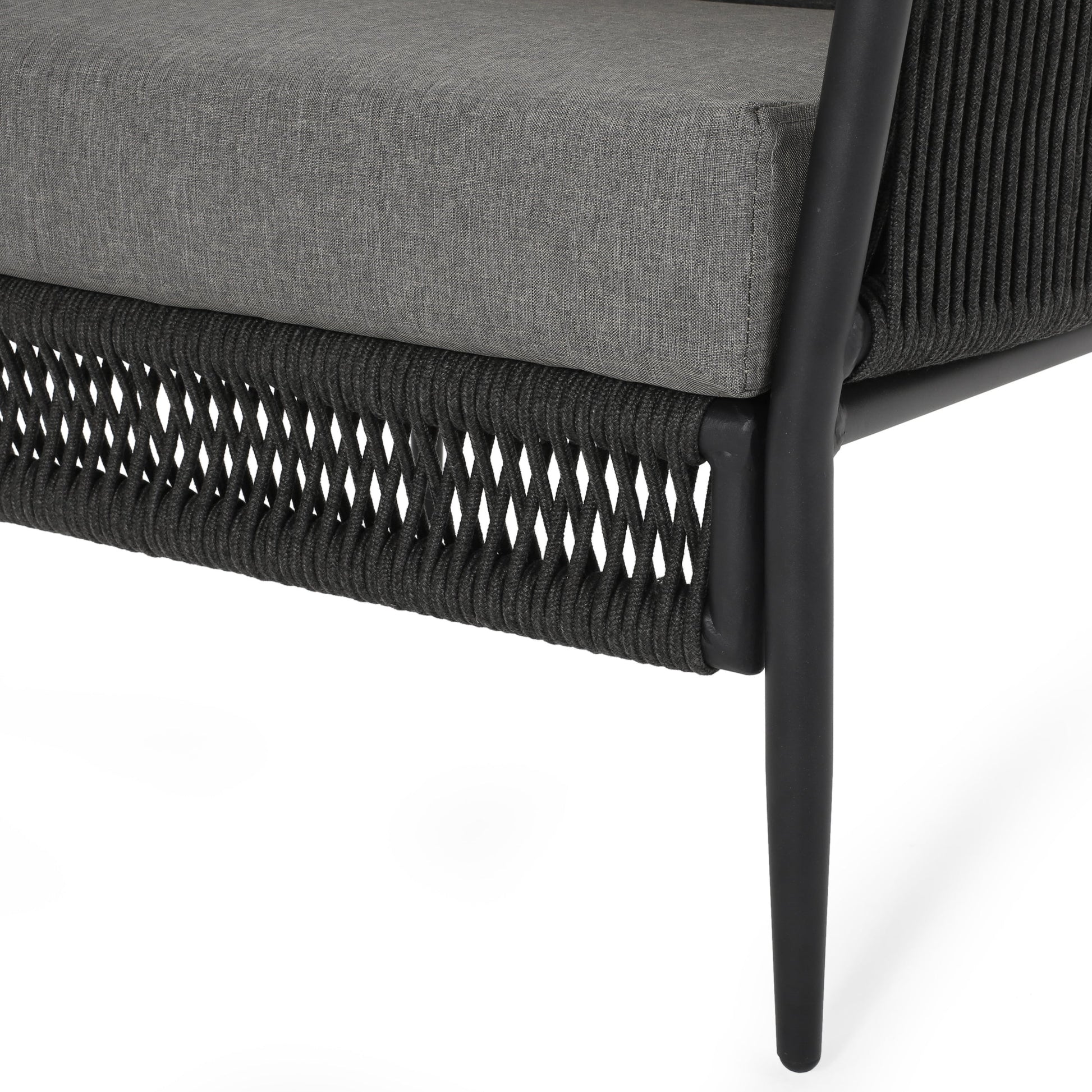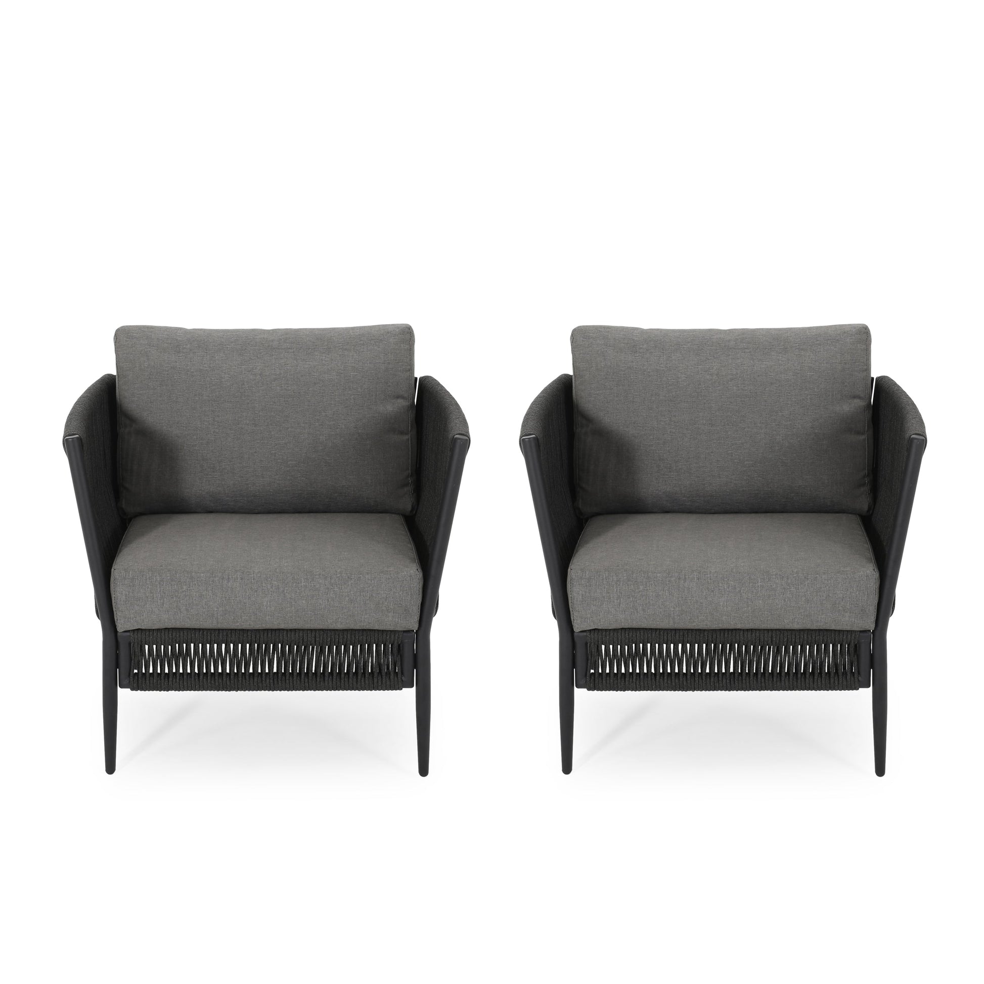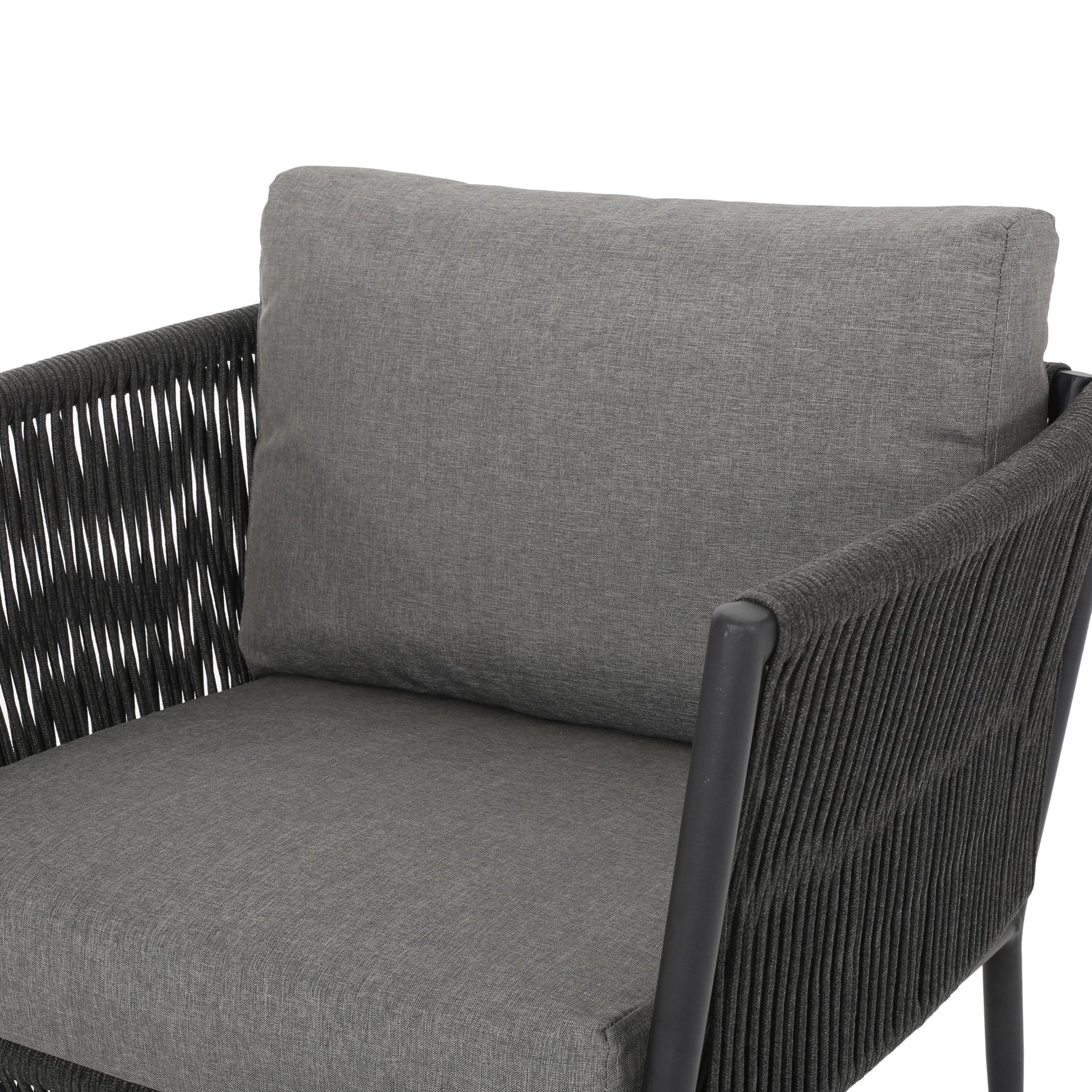 The Hanford Modern Club Chair is a stylish outdoor seating option featuring a woven rope design in grey, perfect for patios, decks, or garden spaces to add texture and comfort.