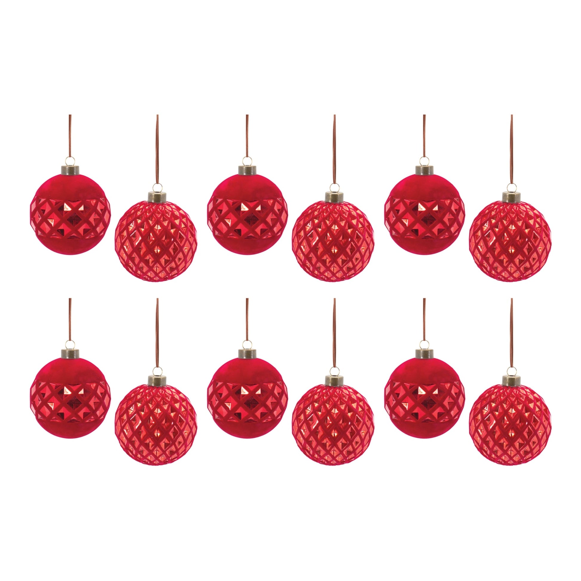 Adorn your Christmas tree and holiday decor with this stunning set of Harlequin Glass Ball Ornament. Featuring 12 pieces, the festive red tones paired with the textured design is the perfect combination to create a memorable display. The quality glass composition and delicate cord string hanging accent is sure to endure for seasons to come. Whether you're adding a touch of cheer to your home or gifting to a loved one, these ornaments will definitely bring smiles.