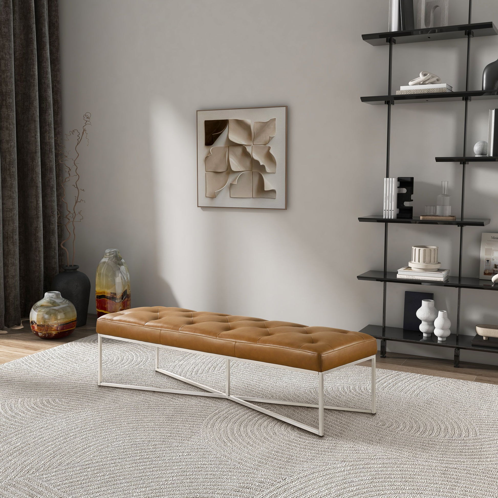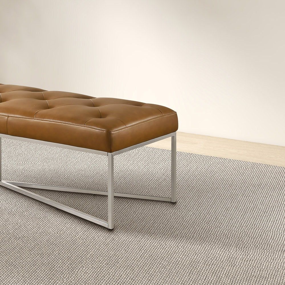 - Premium Upholstery: The Harper Tan Leather Bench is upholstered in full grain leather with buttons, offering a luxurious and sophisticated appearance.