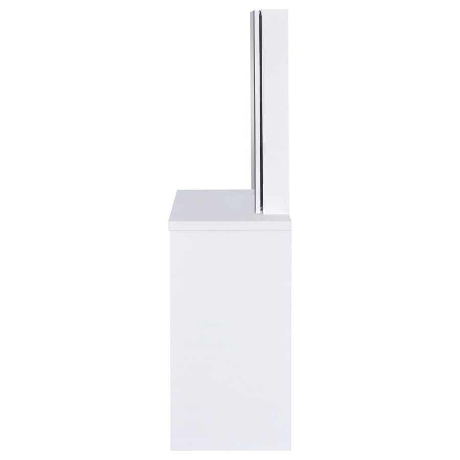 Contemporary vanity looks great in a modern-style bedroom or dressing room and comes designed to hold your secrets better than a BFF. Pull-out drawer is spacious and compartmentalized for organization to get ready in a hurry (on those rare occasions). The large mirror slides open to reveal concealed jewelry storage compartments. Upholstered stool opens to reveal yet another storage area. This vanity truly is a woman's best friend.