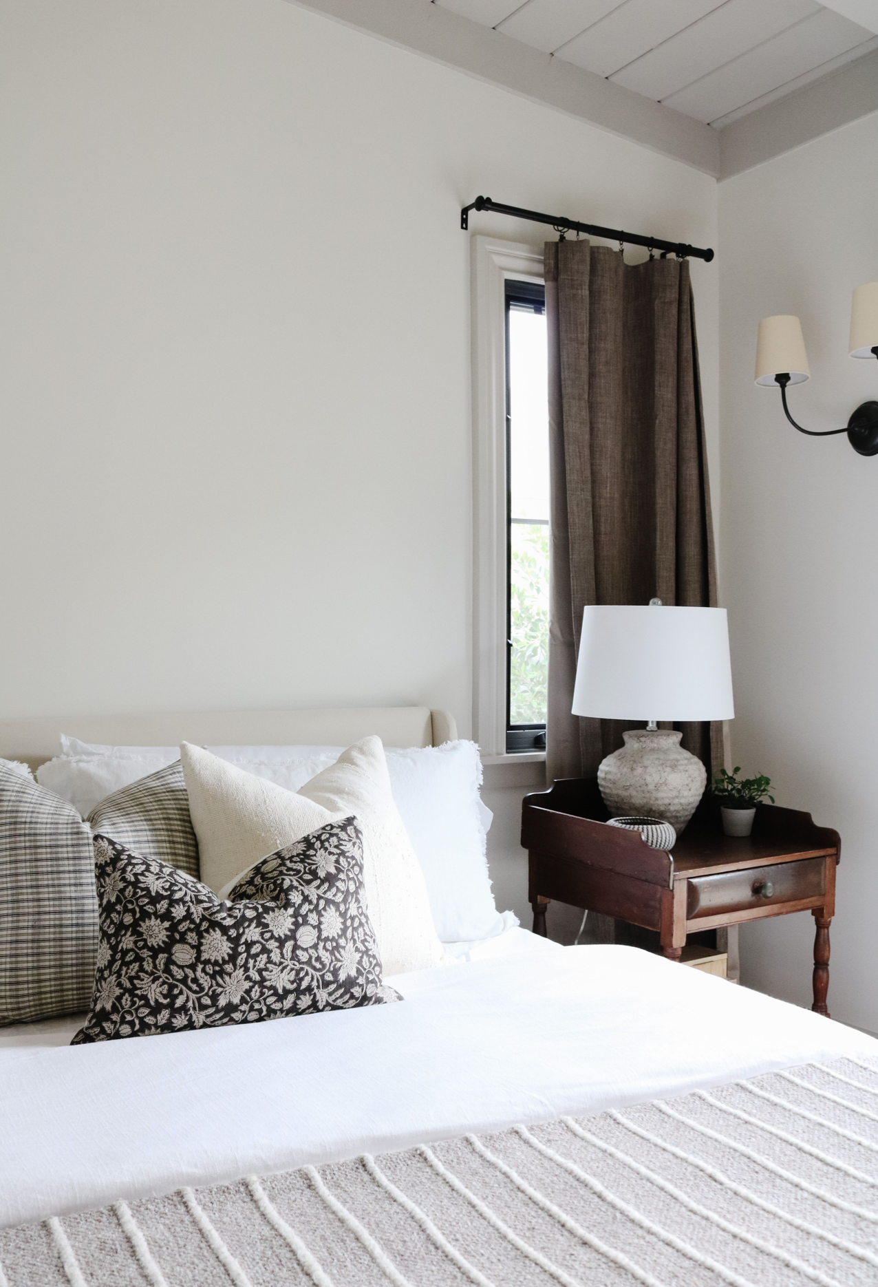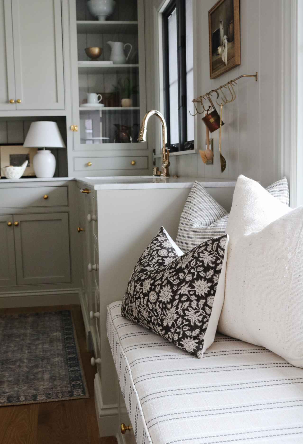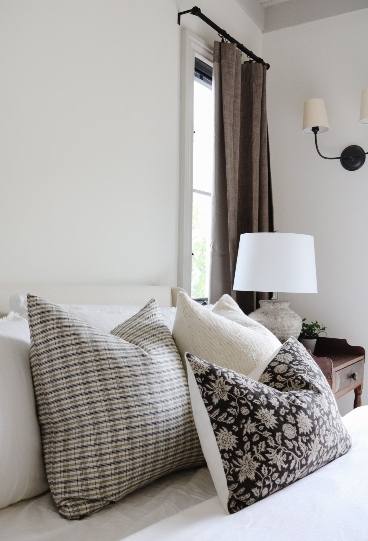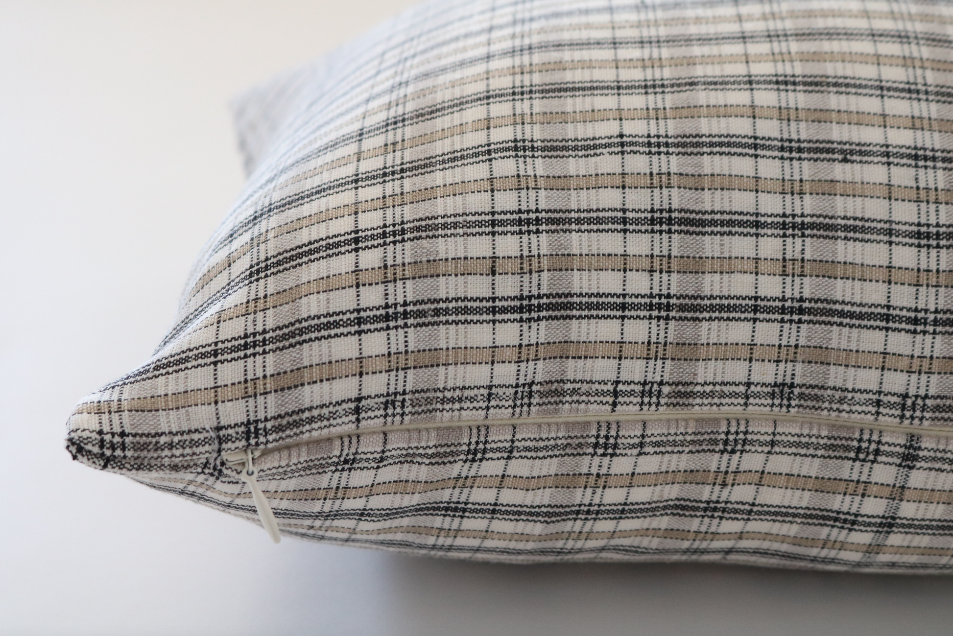 This fabric has a white background with black and light brown stripes. Patterned fabric is on both sides of the pillow cover.