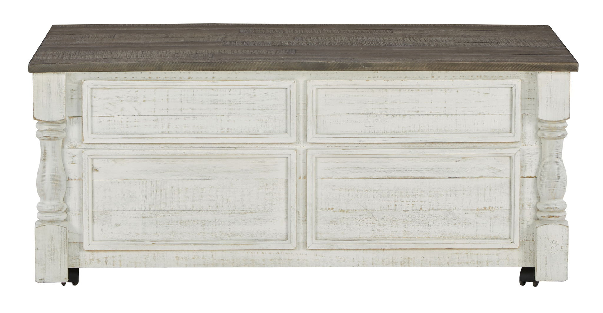 What a fresh interpretation of country classic style. Inspired by American farmhouse craftsmanship, but with an elevated sensibility, this lift-top coffee table blends distinctive details such as turned post accents and raised drawer fronts for a substantial look that feels right at home. Those who appreciate rustic character should take note of the table’s thick crown moulding, beautified with a vintage two-tone finish. It features four storage drawers, a small concealed storage tray under the lift-top, and robust legs that are ready to stand the test of time. And casters allow you to roll it wherever you like.