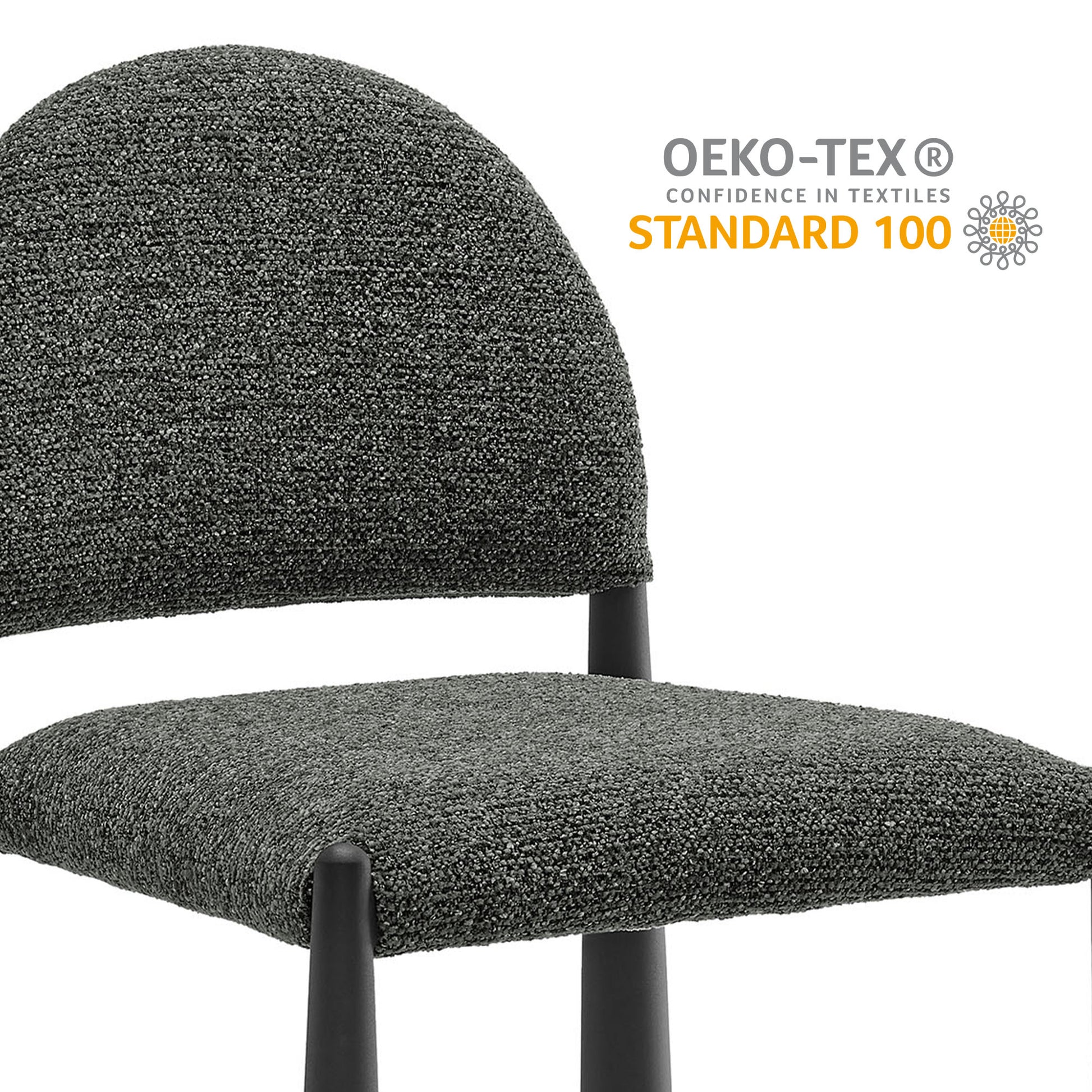 The Hayley Dining Chair strikes the perfect balance between retro charm and modern sophistication. Featuring a semi-circle backrest and a square padded seat, this accent chair is upholstered in a soft, boucl�-style textured OEKO-TEX� STANDARD 100 Certified fabric that adds visual interest and tactile appeal. The distinctive tubular metal legs taper gracefully, creating a bold yet elegant silhouette that elevates your dining, living, or kitchen space. Designed for both comfort and style, the padded backrest and seat ensure a cozy dining experience, while non-marking floor glides protect your surfaces. Arriving fully assembled, the Hayley Dining Side Chair is the perfect choice for mid-century modern enthusiasts or anyone seeking a statement piece for their dining room, kitchen, or living space. Weight Capacity: 300 lbs.
