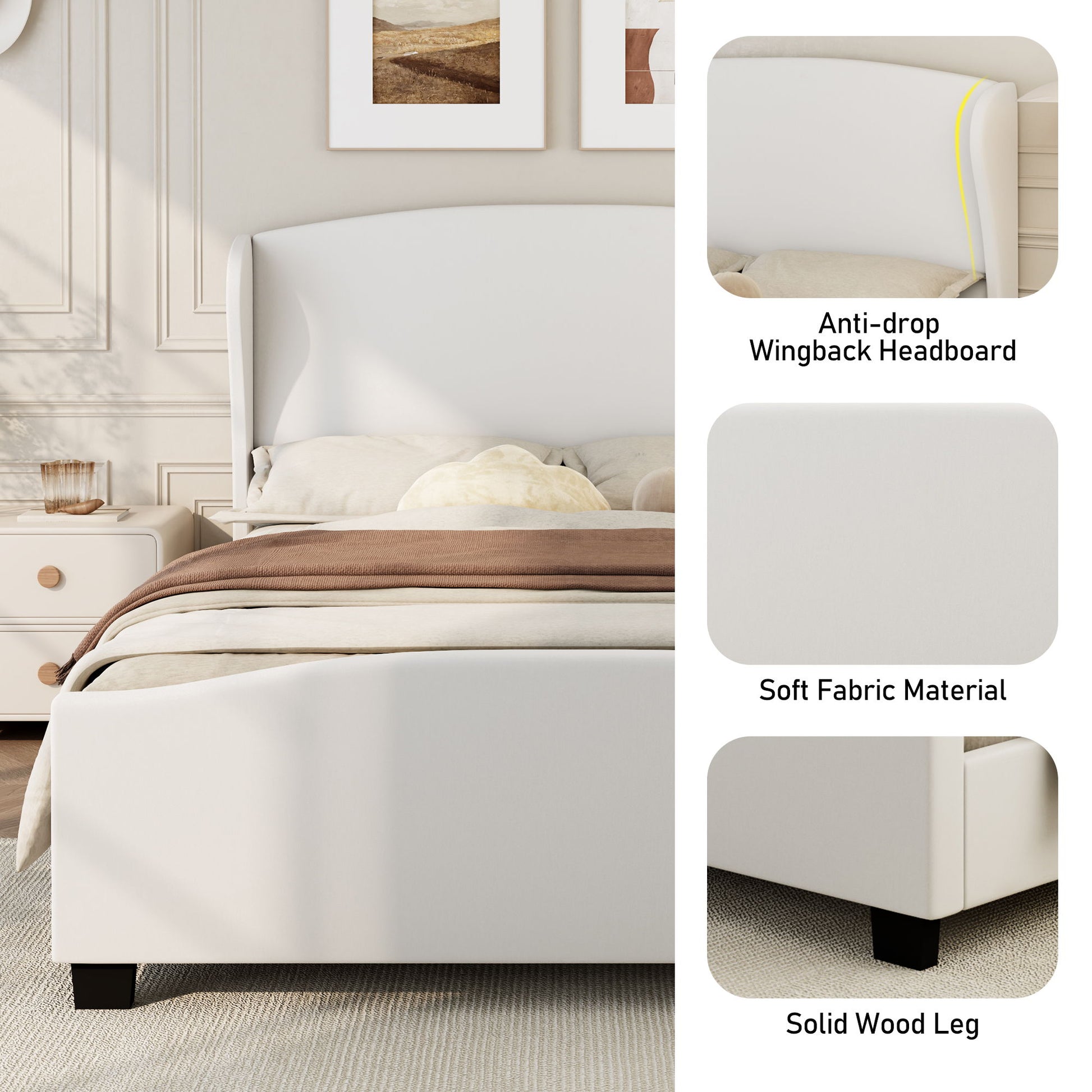Queen Bed High Headboard Modern Wingback Linen Upholstered - Beige