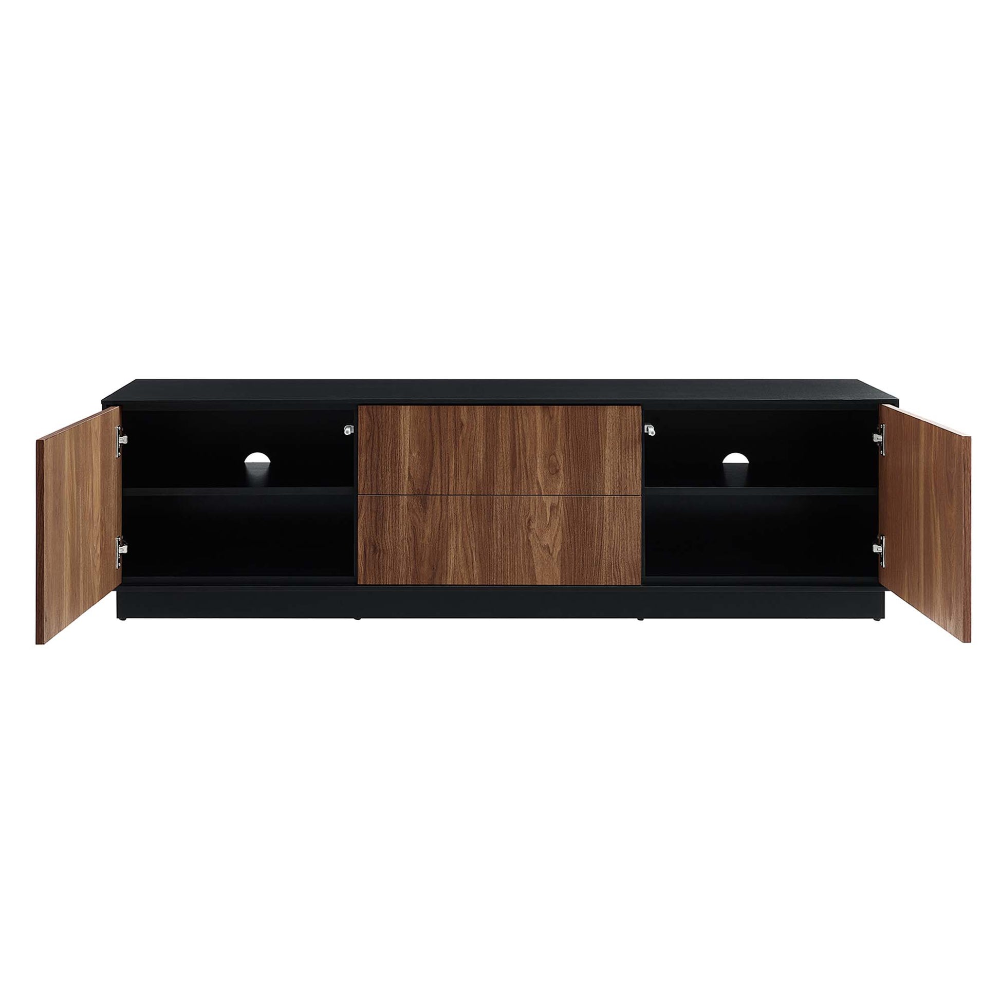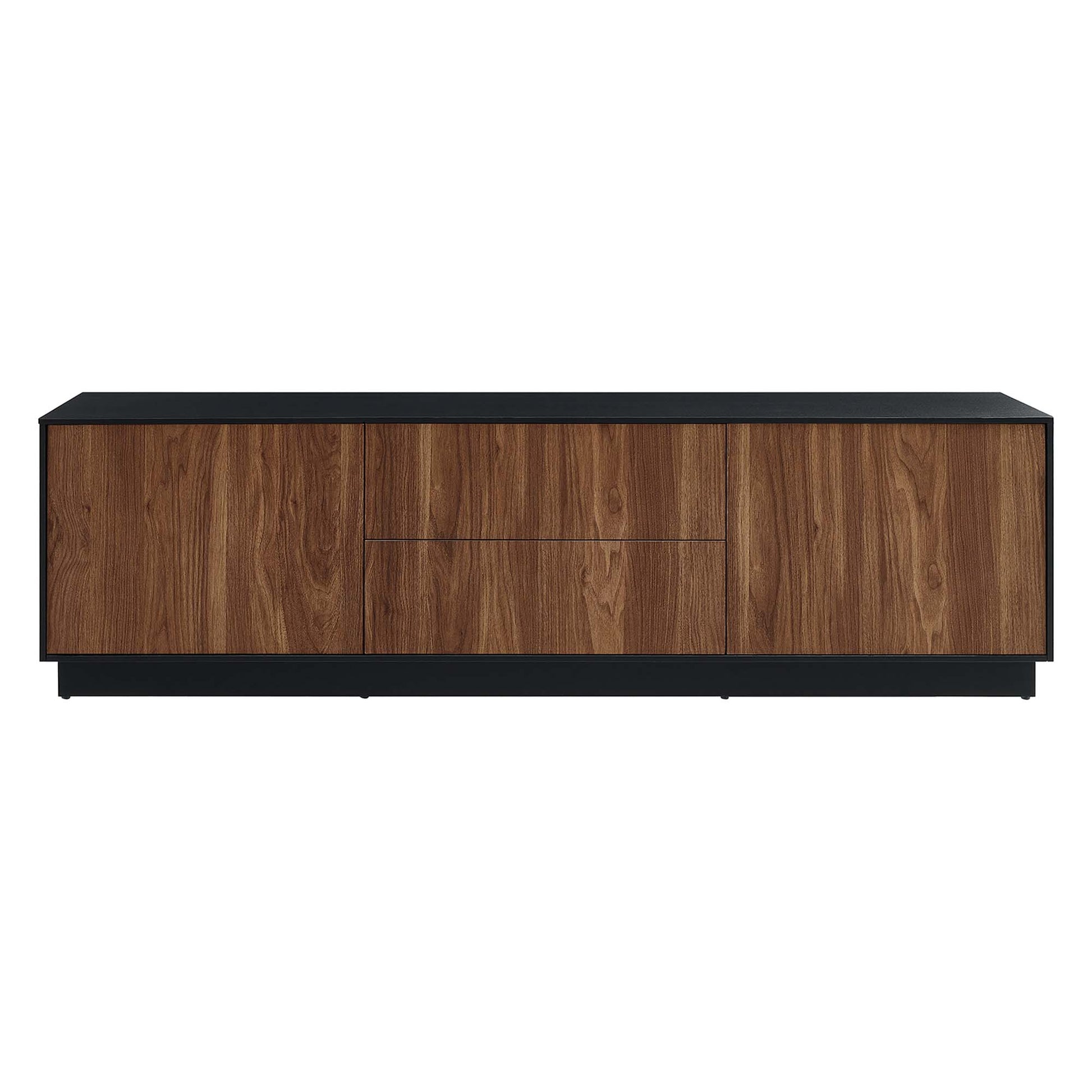 Merge sophistication and utility with the Holden 63� TV Stand. Constructed from MDF and durable particleboard, this TV stand features a wood grain laminate on its cabinets and drawers. Bestowing a rustic flair that complements any contemporary setting, Holden supports flat screen TVs up to 70 inches. Experience modern convenience with push-to-open cabinetry and thoughtfully designed shelving behind two hinged doors. Featuring two full-glide drawers, two cable management holes, and resting on a sleek plinth base, the versatile storage solutions of Holden's design allow it to serve as a spacious living room storage unit for media devices, games, gadgets, and other household items. Assembly Required. Weight Capacity: 200 lbs.