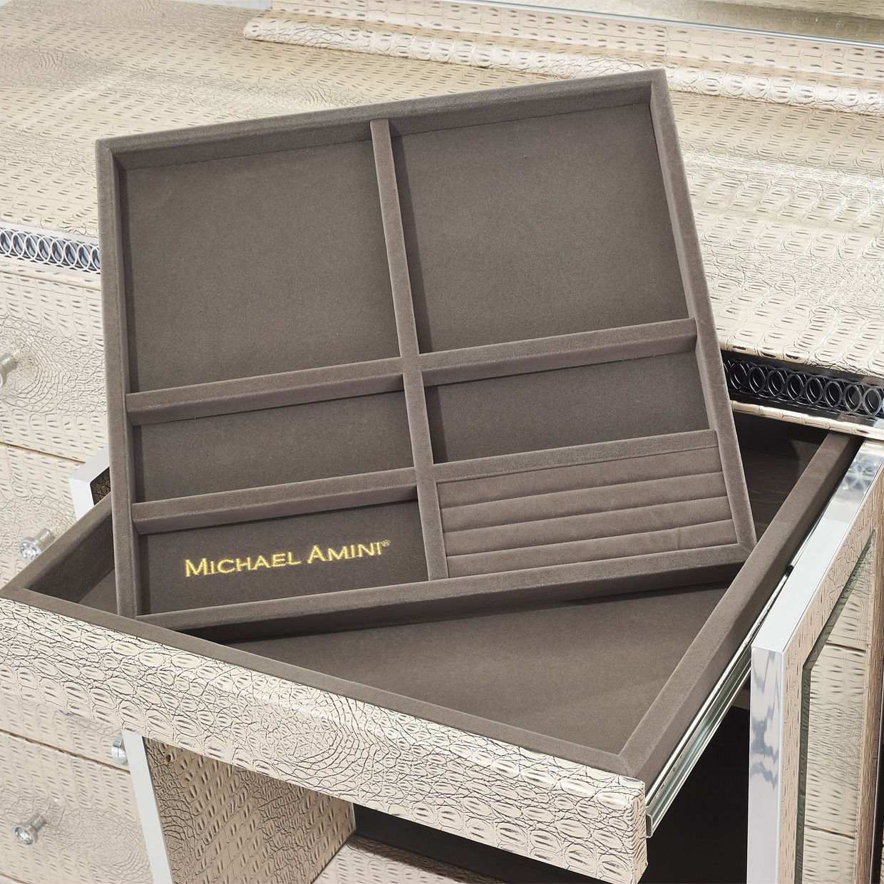 - Dresser contains 8 velvet lined drawers with self closing glides