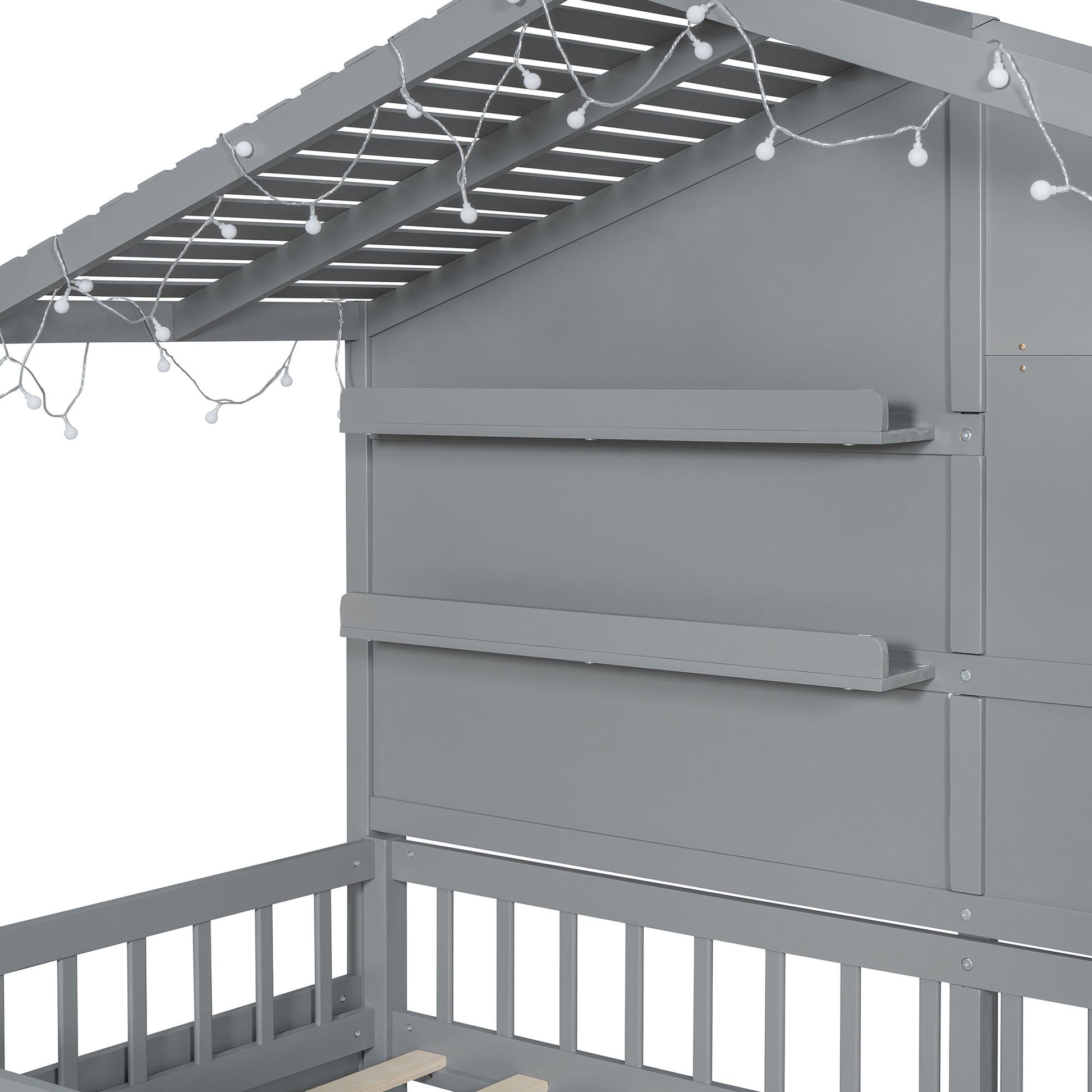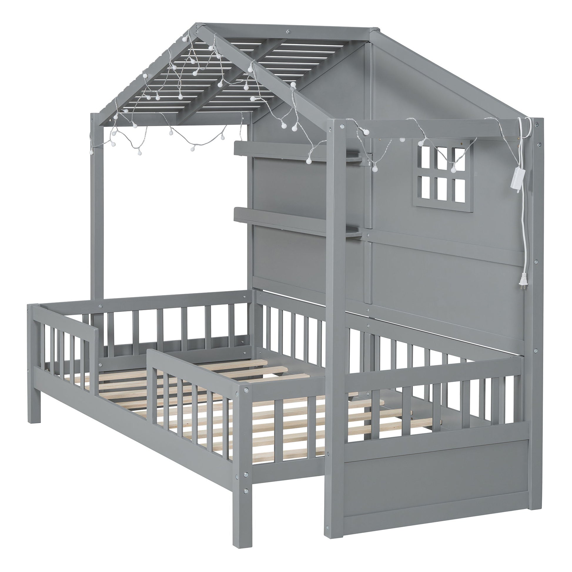 Twin Size House Bed With Shelves, Window And Sparkling Light Strip On The Roof - Gray