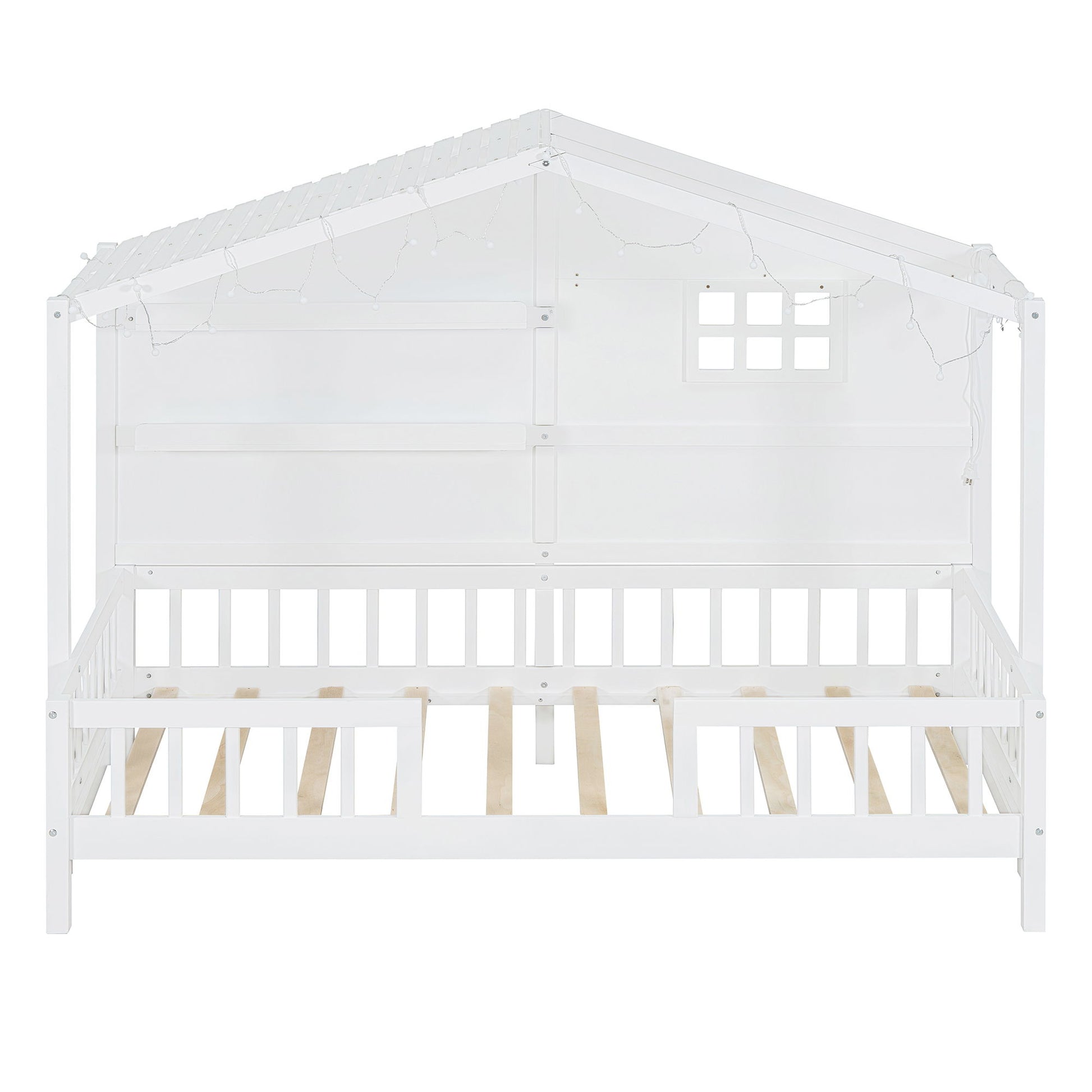 Twin Size House Bed With Shelves, Window And Sparkling Light Strip On The Roof - White