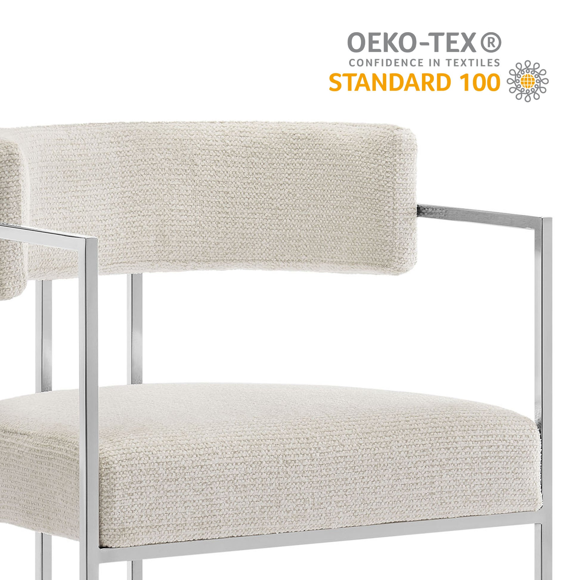 Elevate your dining room, living space, or workspace with the Huron Curved Back Dining Chair, a true fusion of artful design and functional comfort. Featuring a bold barrel silhouette with a curved metal frame and unique sled base, this modern dining chair offers a sleek, architectural profile that enhances contemporary interiors. Upholstered in soft woven fabric with a textured depth, the padded seat and backrest ensure luxurious comfort for dining, working, or relaxing. Better for you and the environment, the upholstery fabric is also OEKO-TEX� STANDARD 100 Certified. Perfect as a dining chair, accent chair, vanity chair, or desk chair, Huron's sculptural shape and supportive arms add sophistication and retro style to any room. Designed for effortless living with 70's flair, this upholstered chair with metal frame includes adjustable non-marking floor glides to protect surfaces and arrives fully assembled for immediate use. Weight Capacity: 300 lbs.