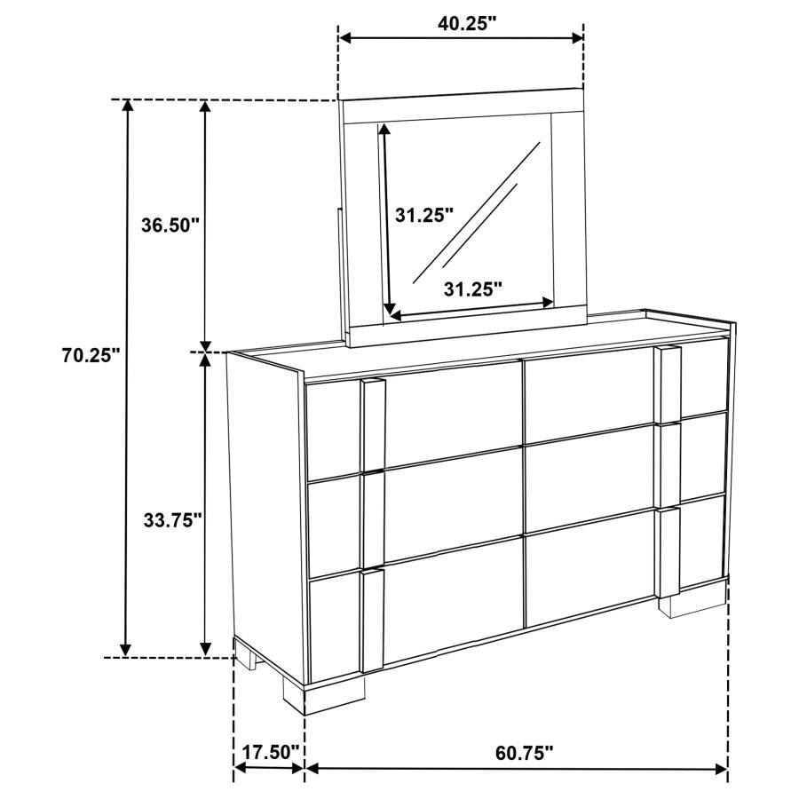 Enhance your bedroom with the contemporary elegance of this six-drawer dresser. Inspired by modern Italian design, it features a sophisticated blend of natural wood tones and off white panels crafted from durable, easy-care melamine. The drawers, equipped with metal extension glides and pin-construction joinery, offer smooth operation and ample storage for your clothing and accessories. The vertical lines of the natural finish hardware add a touch of sleek sophistication, perfectly complementing the dresser's clean lines and modern aesthetic. This dresser is not just a storage solution but a stylish focal point that elevates your home decor.