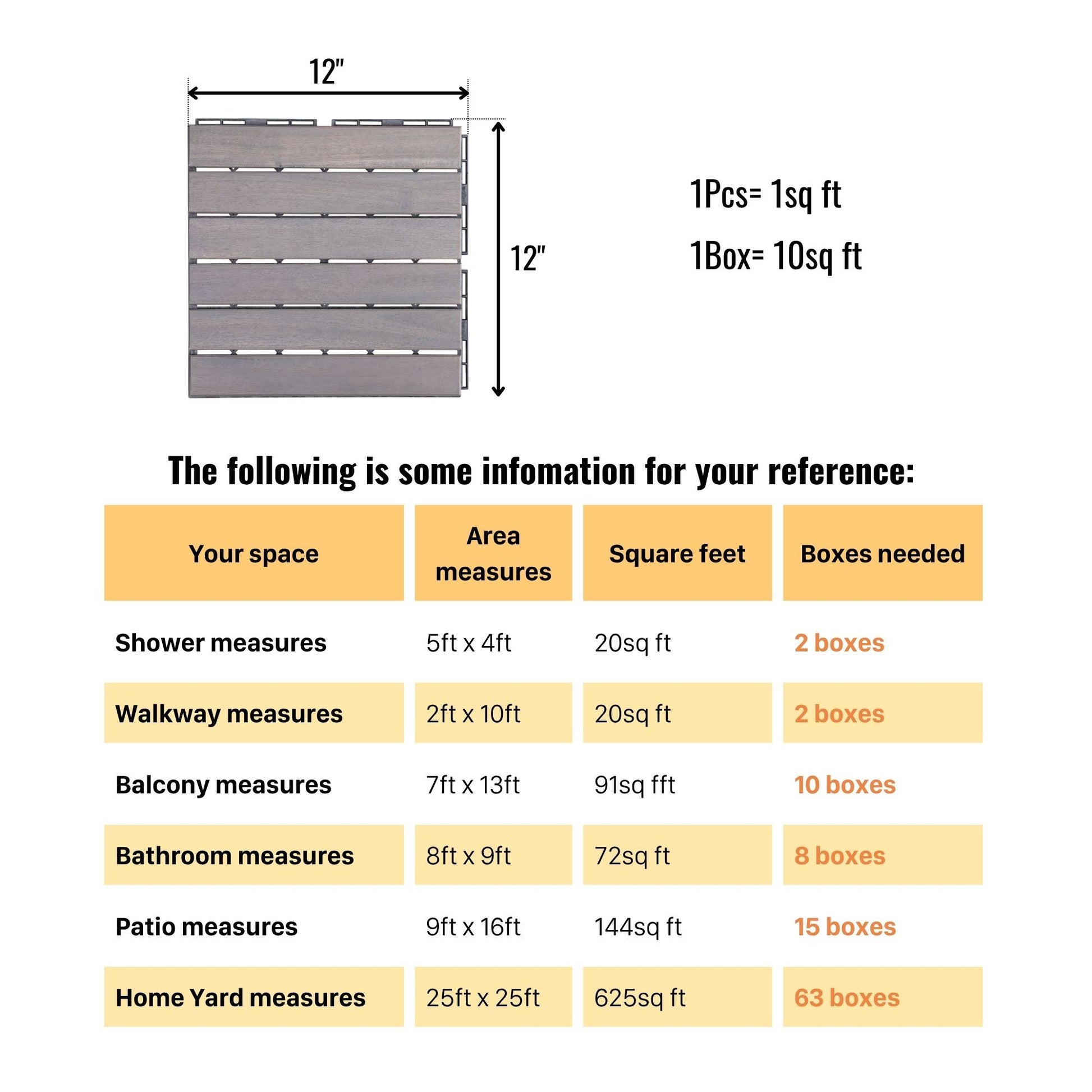 - Perfect Size: Each tile measures 12" x 12" with a thickness of 0.75 inches, combining 0.47 inches of wood and 0.28 inches of plastic for effective drainage.