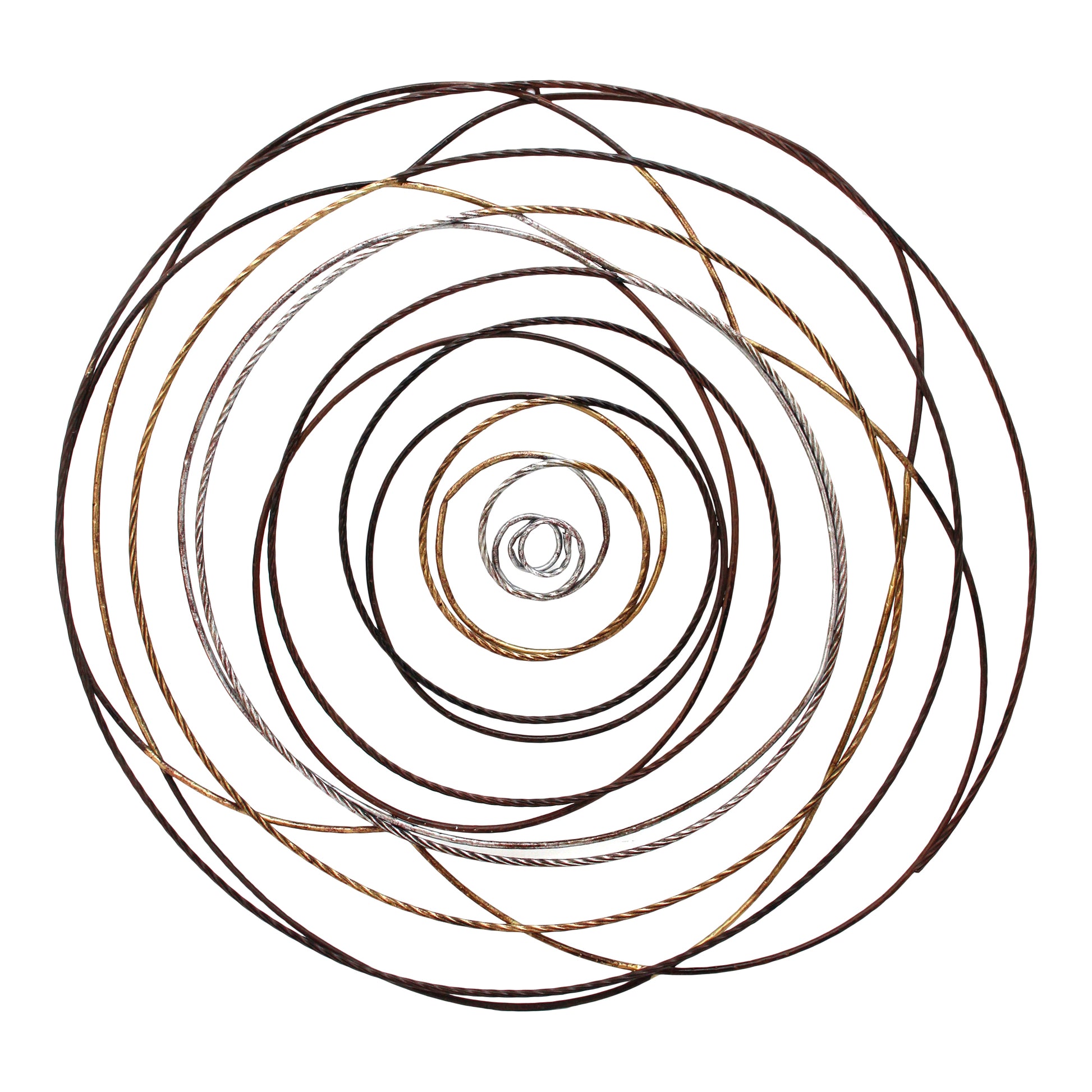 The Iron Braid wall accent casts an aura of sophistication with its sprawling circumference, hand-made from iron with gold and silver finishes, spun to resemble a rope. Its grand scale adds a touch of elegance, bringing a captivating interest to any space -- a true statement piece for the contemporary home.