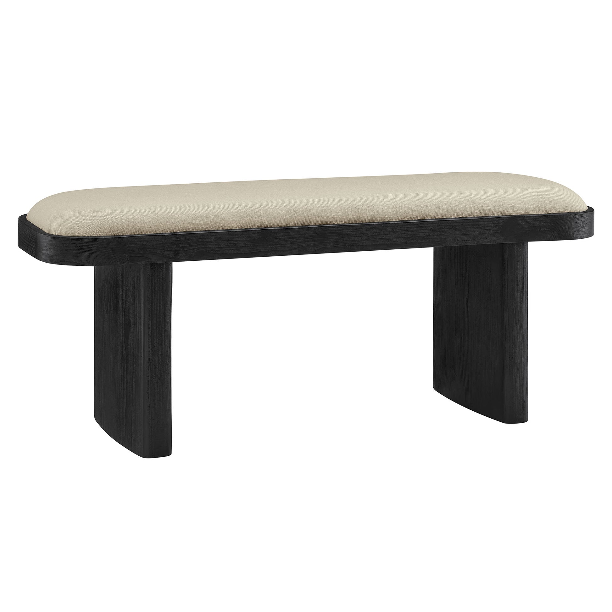 The Iver Oval Wood Fabric Bench brings a modern touch to any space with its sleek design and functional versatility. Crafted with a kiln-dried solid pine wood frame and upholstered in a soft cotton-blend fabric, this 43-inch bench offers dense foam padding for added comfort. Its oval-shaped seat and uniquely angled legs create a striking silhouette that complements contemporary and minimalist decor. Adjustable floor protectors provide stability and protect your floors, making it a practical choice for busy areas. Perfect for entryways, bedrooms, or living rooms, this mudroom bench combines clean lines with practical design. Assembly required. Weight Capacity: 200 lbs.
