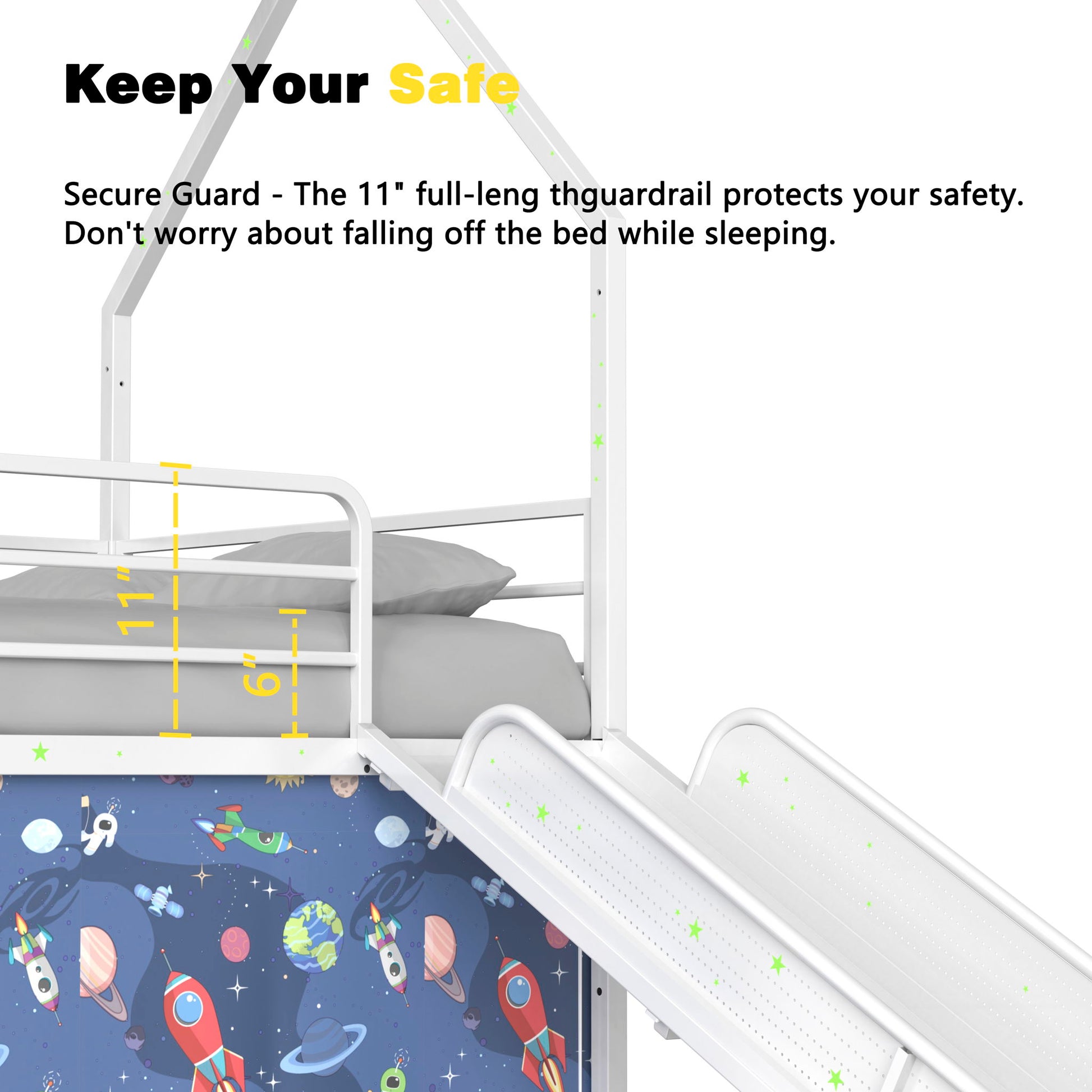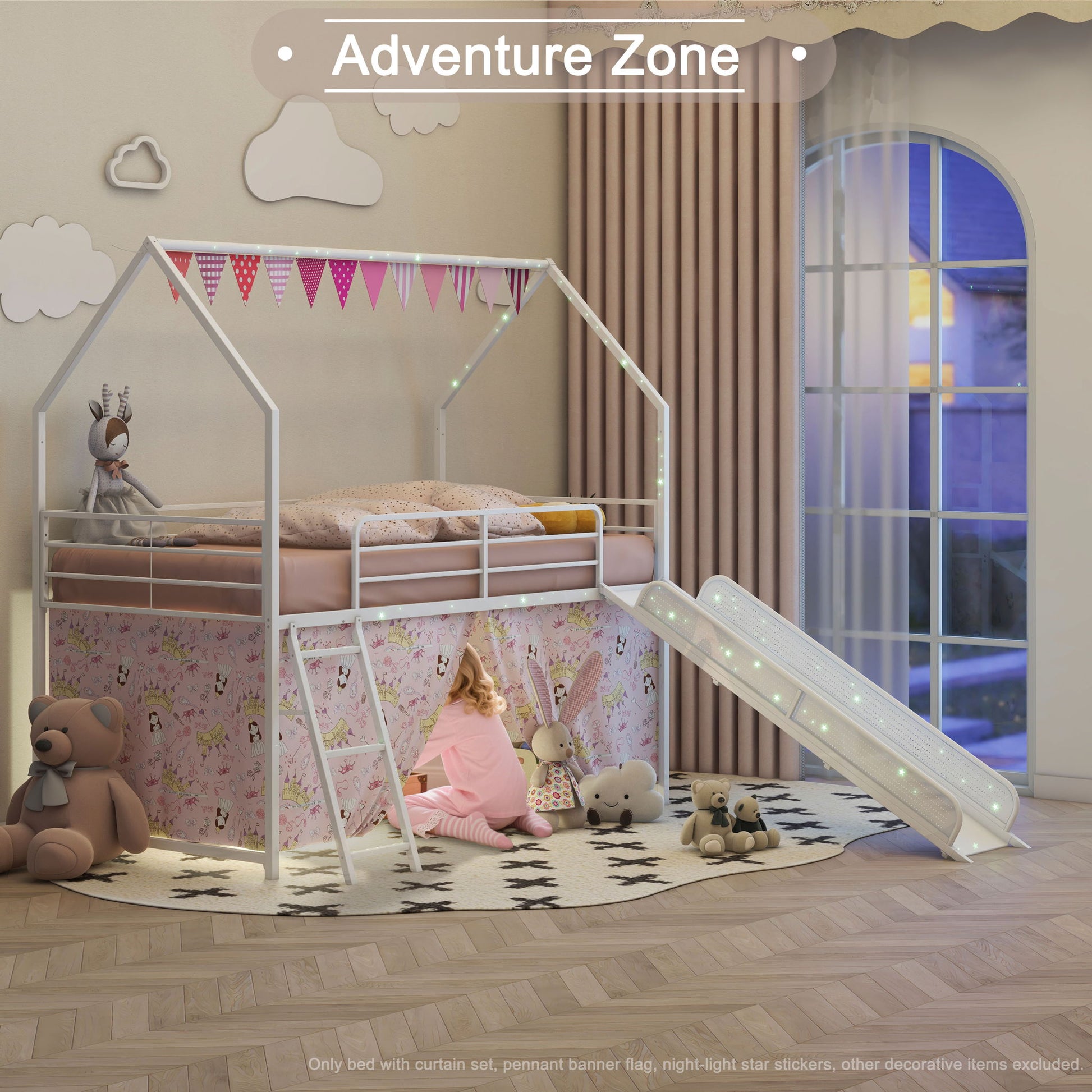 - Playful Design with Slide & Accessories: Transform your child' room into a fun-filled haven with a house-shaped bunk bed, complete with a built-in slide, luminous star stickers, a pennant banner. The lower bed includes a curtain for a cozy, private space.