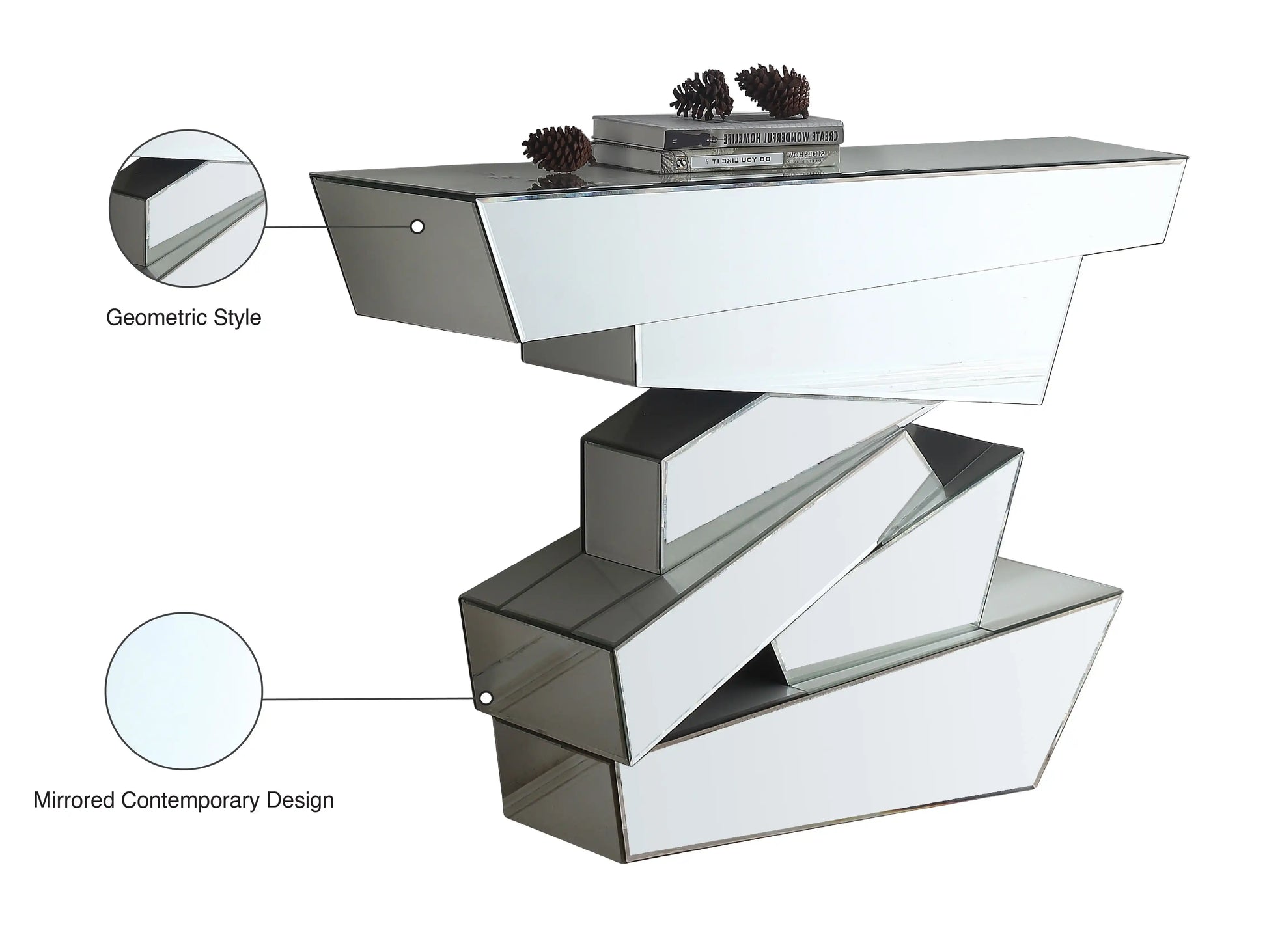Elevate your interior with this Jade console table. This handsome table features a staggered geometric base that makes it look more like an intricate sculpture than the actual piece of furniture it is. Every surface of the base is mirrored, so it reflects light and adds spacious appeal and dimension to your space. The top is made from thick glass and amply sized to hold collectibles or photos.