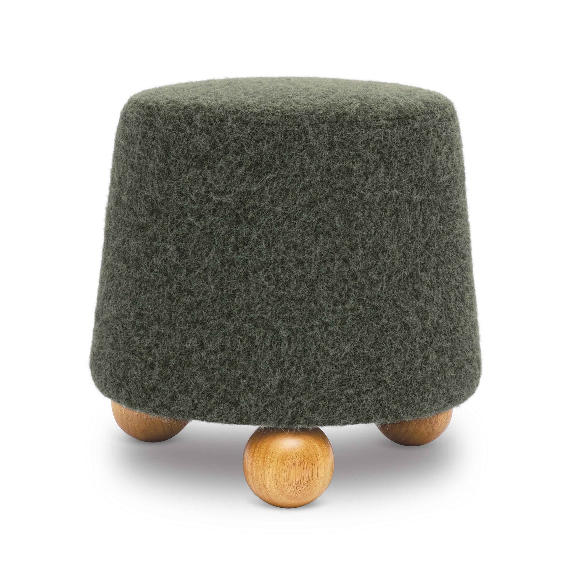 Add a playful charm to your space with the Jaine Stool, boasting a slightly conical shape that catches the eye. Its spherical solid wood legs provide a sturdy base, while the nubby boucle or loose faux mohair upholsteries add a modern, textured touch. Not only is it on-trend with its color palette, but this ottoman also seamlessly blends contemporary style with a tactile experience, making it a must-have for any room. Also available in two size variations!