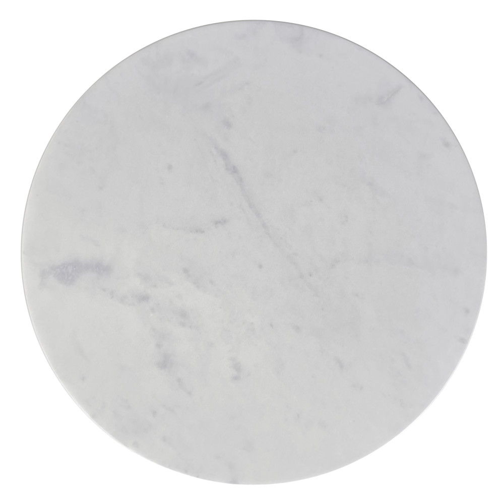 - Features spacious round white marble tabletop, gold powder coated stem and black powder coated pedestal base