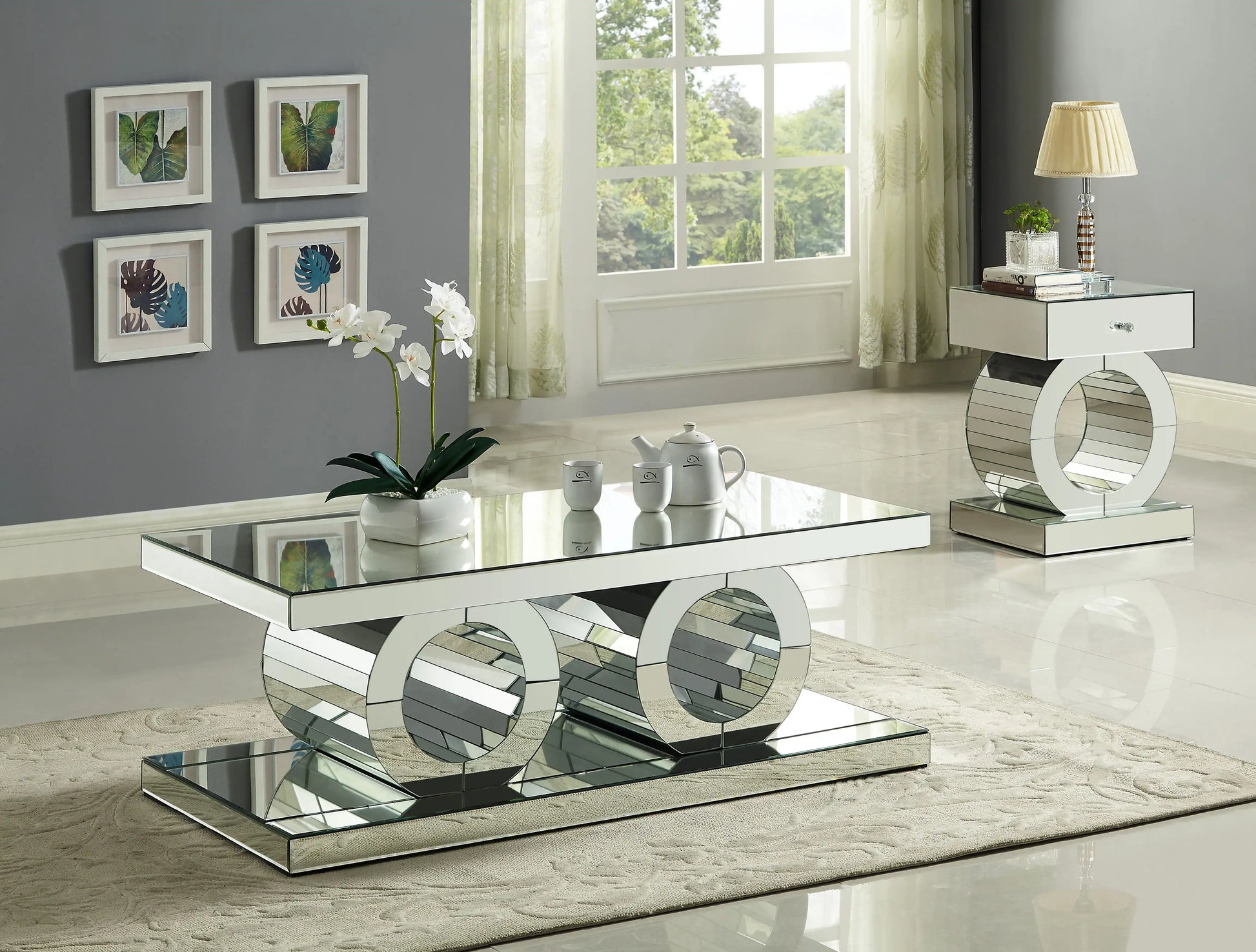 Make this Joceyln coffee table the center of attention in your living room. This handsome table features a bold design with a geometric footprint that's sleek, chic, and modern. The surface areas of the table are covered in mirrored accents and crystal acrylics, adding depth and dimension to your room while upping the piece's wow factor. The large surface area gives you room for displaying books or other collectibles. Pair it with other items in the Jocelyn collection for a coordinated, modish finish.