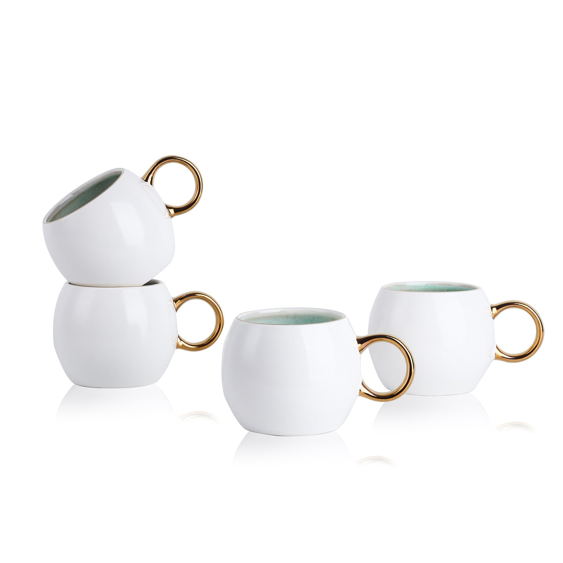 The Stone + Lain Josephine porcelain mug set set is formal and unique with a stunning reactive glazed speckled interior, making each dish perfectly imperfect. This set includes mint and white speckled mugs with a white exterior created from the reactive glaze process, making it perfect for everyday-glam dining. The cups are perfect for coffee, tea, and hot chocolate! These elegant dishes feature a gold rim and handle that is perfect for your formal dinnerware or for elevated everyday-glam morning coffee. This set of 4 can be used to replace broken mugs, or you can use it to add-on to your existing Josephine set if you need extra cups on hand! Pair this set with your favorite Josephine plates and you are ready to for a fancy and glam dining experience. Josephine is microwave safe for easy reheating. Grab a set today and experience fun dining at home.