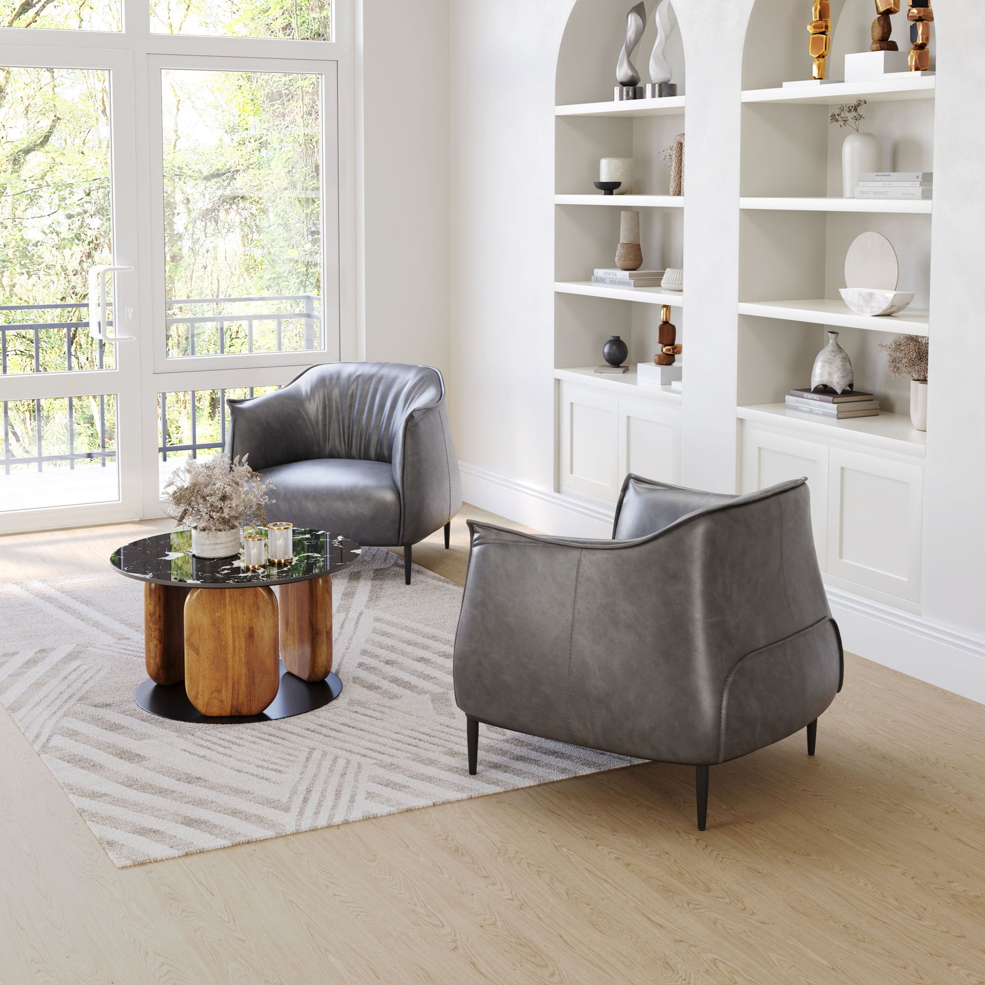 The Julian Occasional chair has soft marbled 100% Polyurethane fabric in a rich color, with curved lines and a slim wood legs.