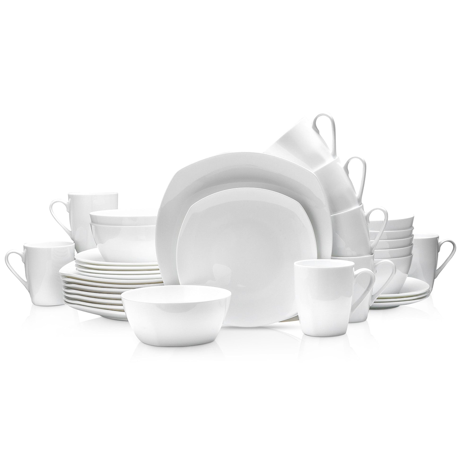This classic set of white bone china tableware includes large square dinner plates, classy square salad plates, deep bowls and mugs. These home essentials are expertly crafted and artfully designed. 100% dishwasher and microwave safe for easy cleaning and durability. The elegant dot detailing borders each dish in this exemplary set. These pieces go great in either a formal or casual setting. Lay out your favorite tablecloth, cutlery, and stemware, and let the Stone Lain bone china dishes do the rest. Thank you for choosing Stone Lain, where dishes come true.