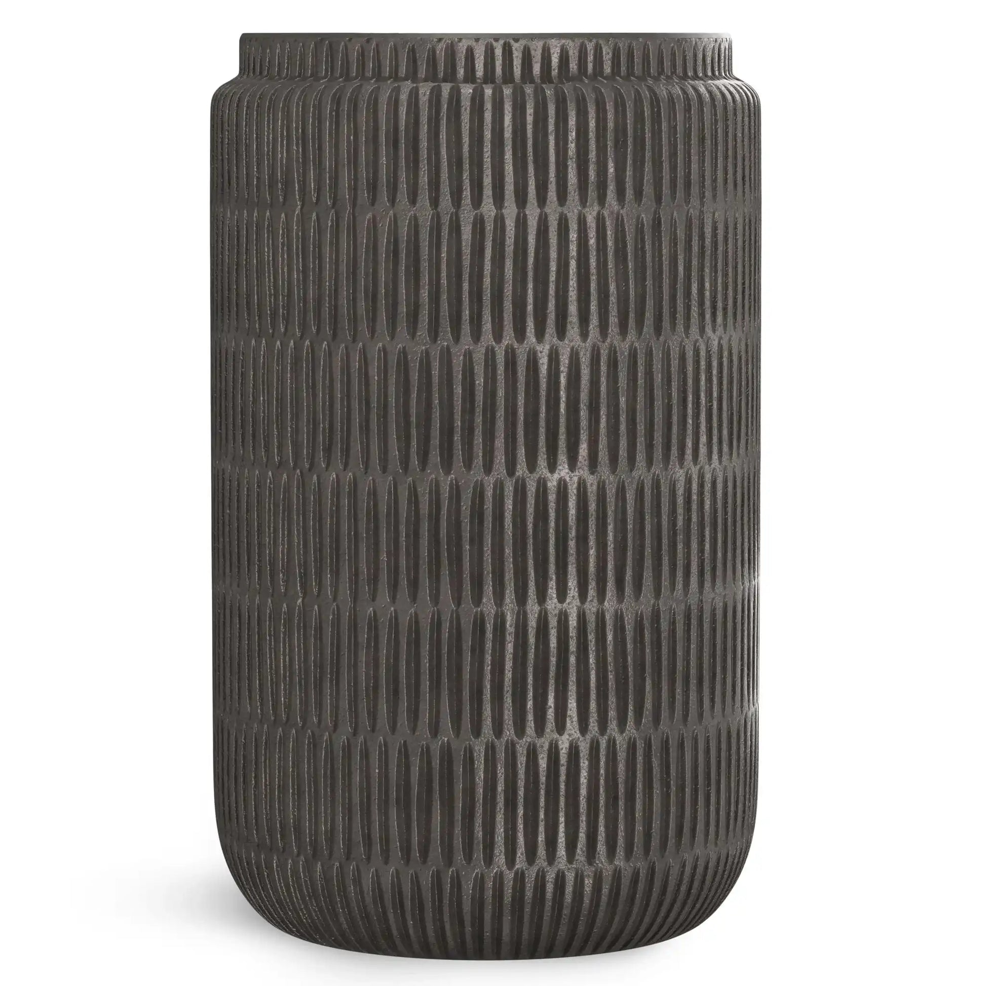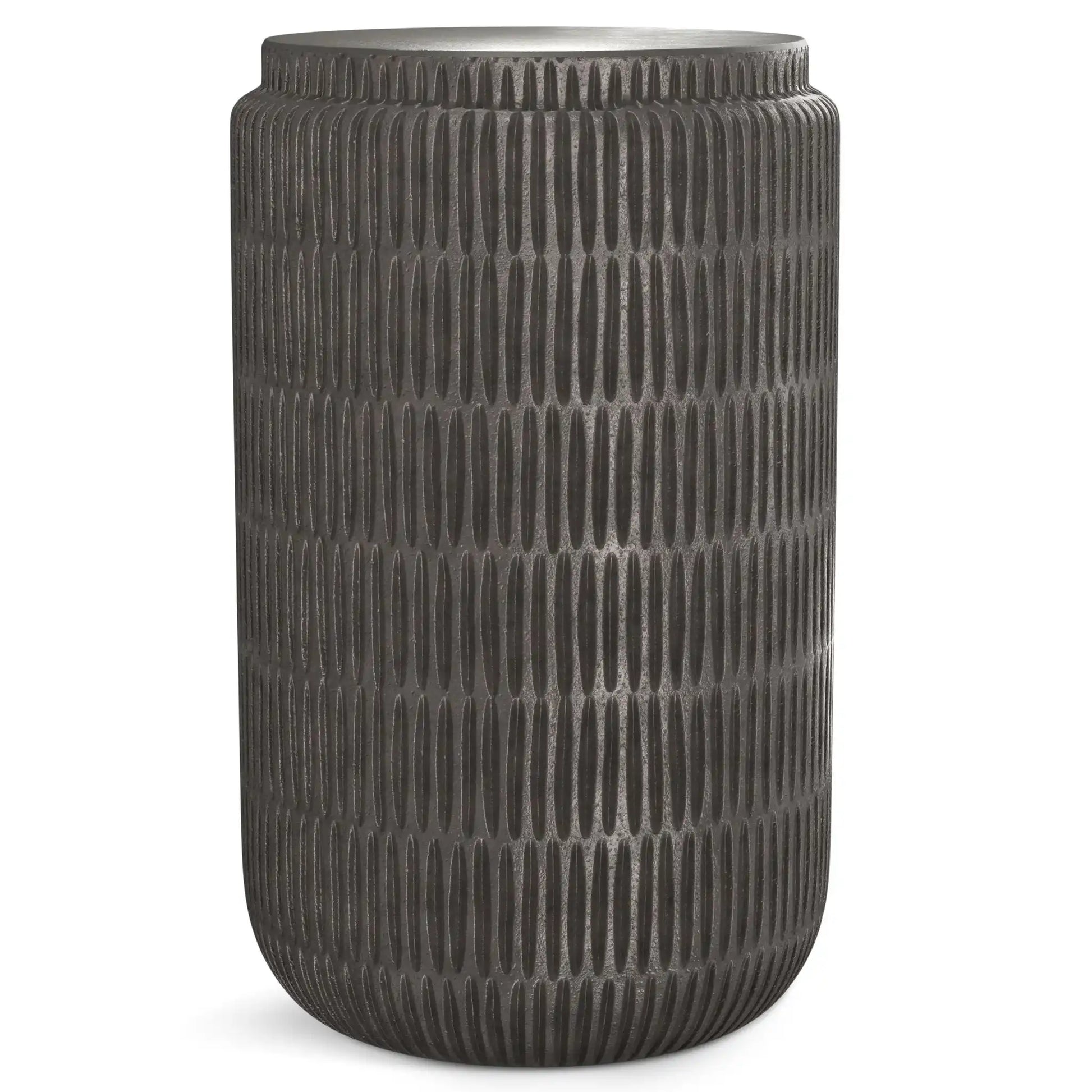 - Hand-finished in Graphite with a subtle texture on the tabletop and a lined textured pattern on the base that make each piece unique.