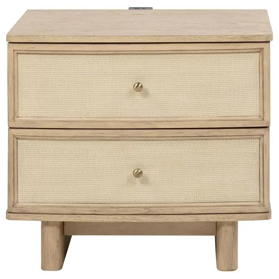 This nightstand combines practicality with elegant design, offering two drawers for convenient bedside storage. Finished in beige oak, it features smooth metal extension glides for easy access and antique brass hardware for a touch of vintage charm. The integrated USB and Type-C charging ports keep your devices powered and within reach. Its clean lines and thoughtful details make this nightstand a perfect fit for any bedroom setting. Enjoy the perfect balance of function and style with this essential piece.
