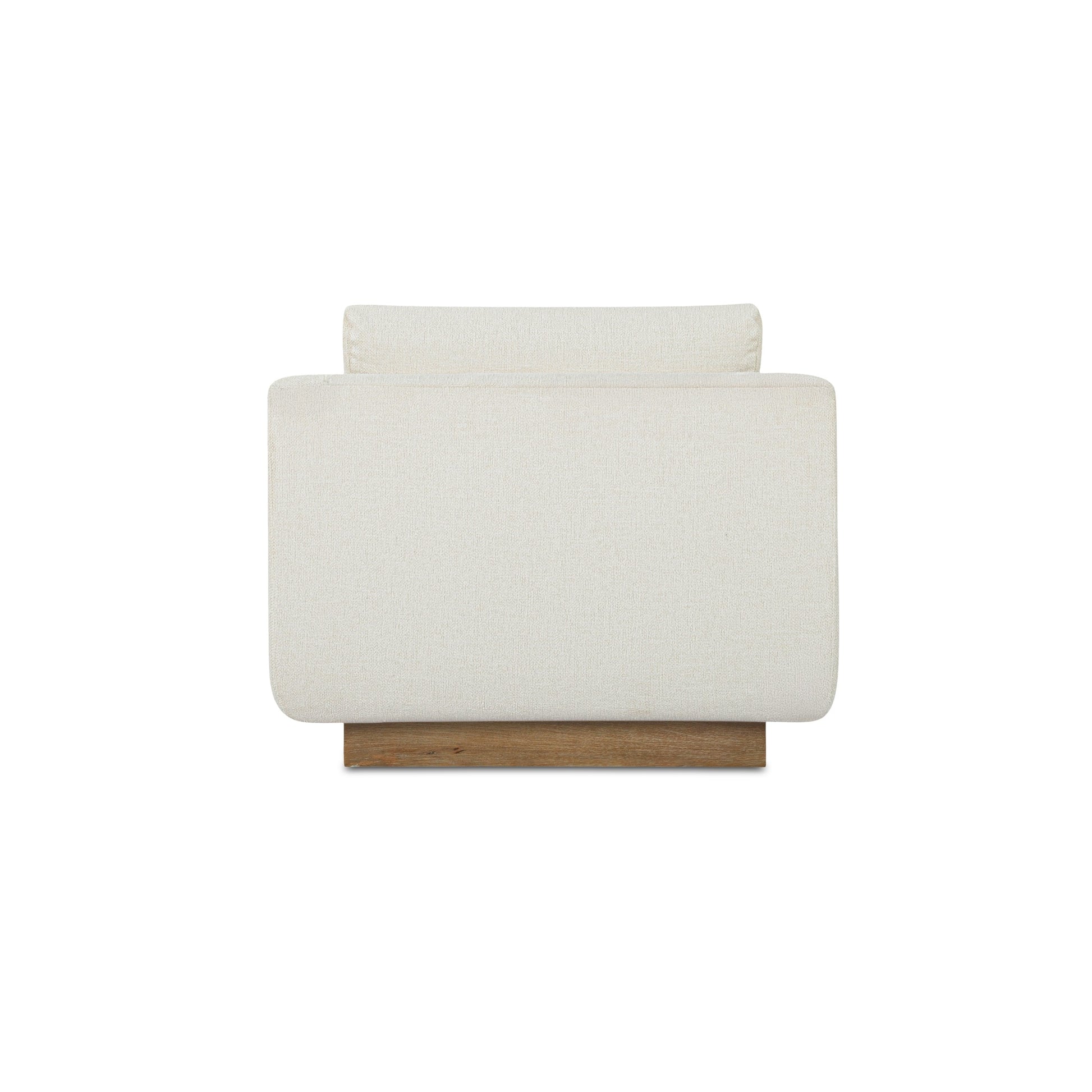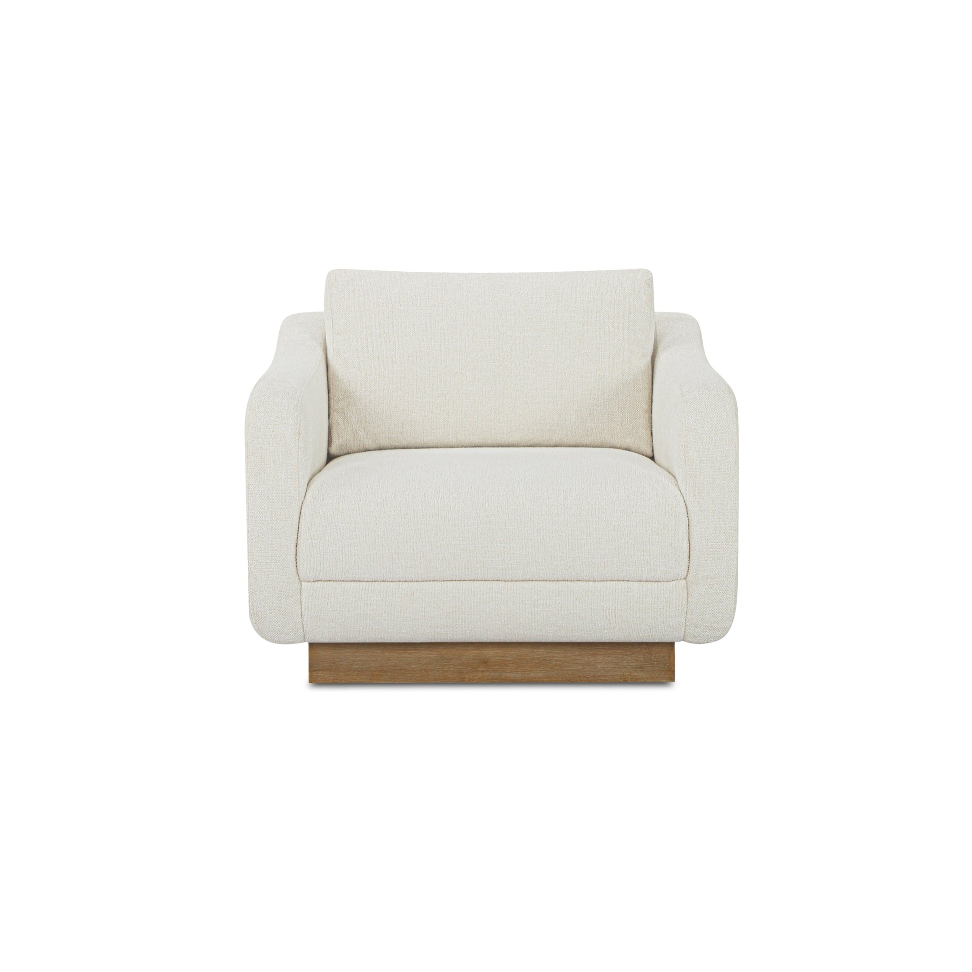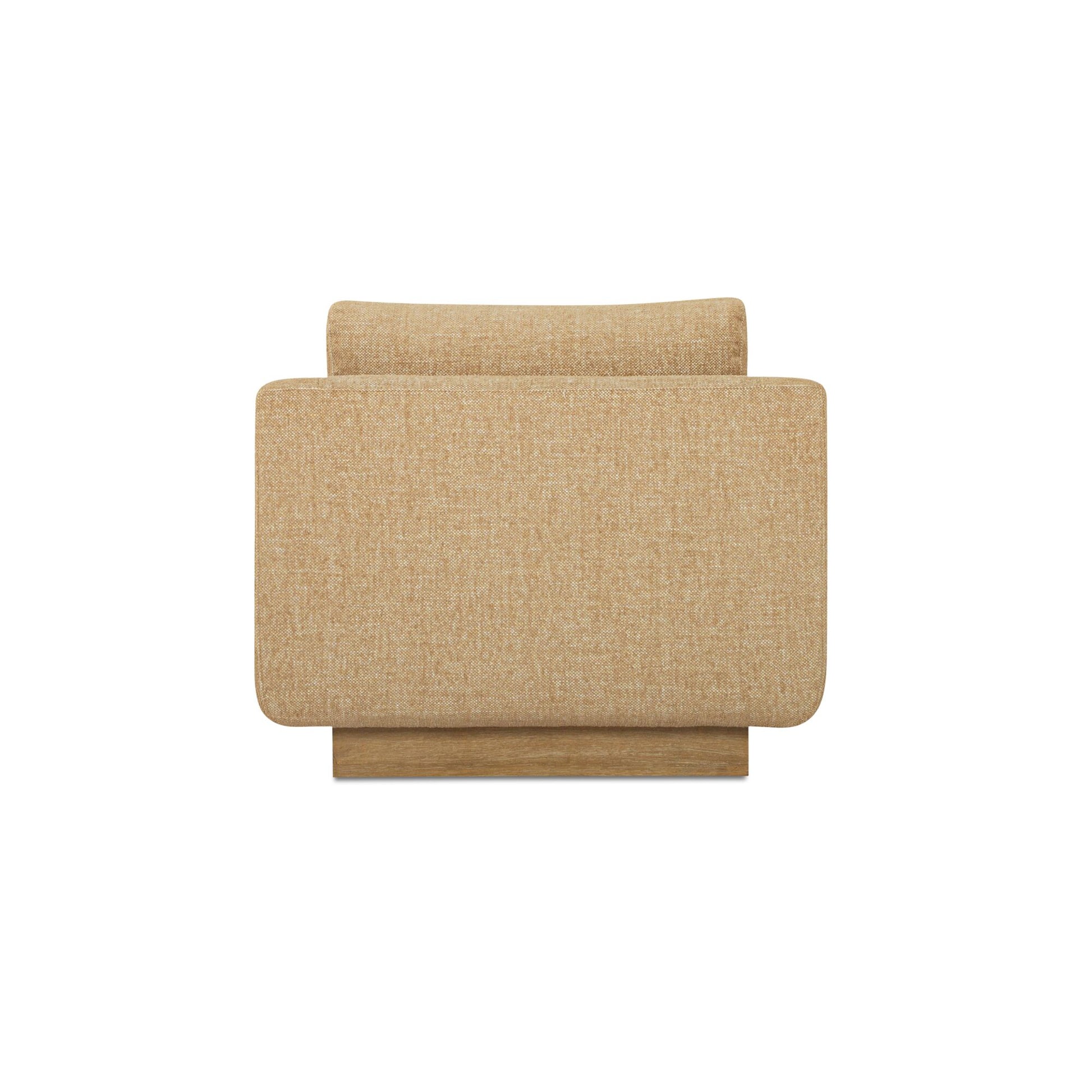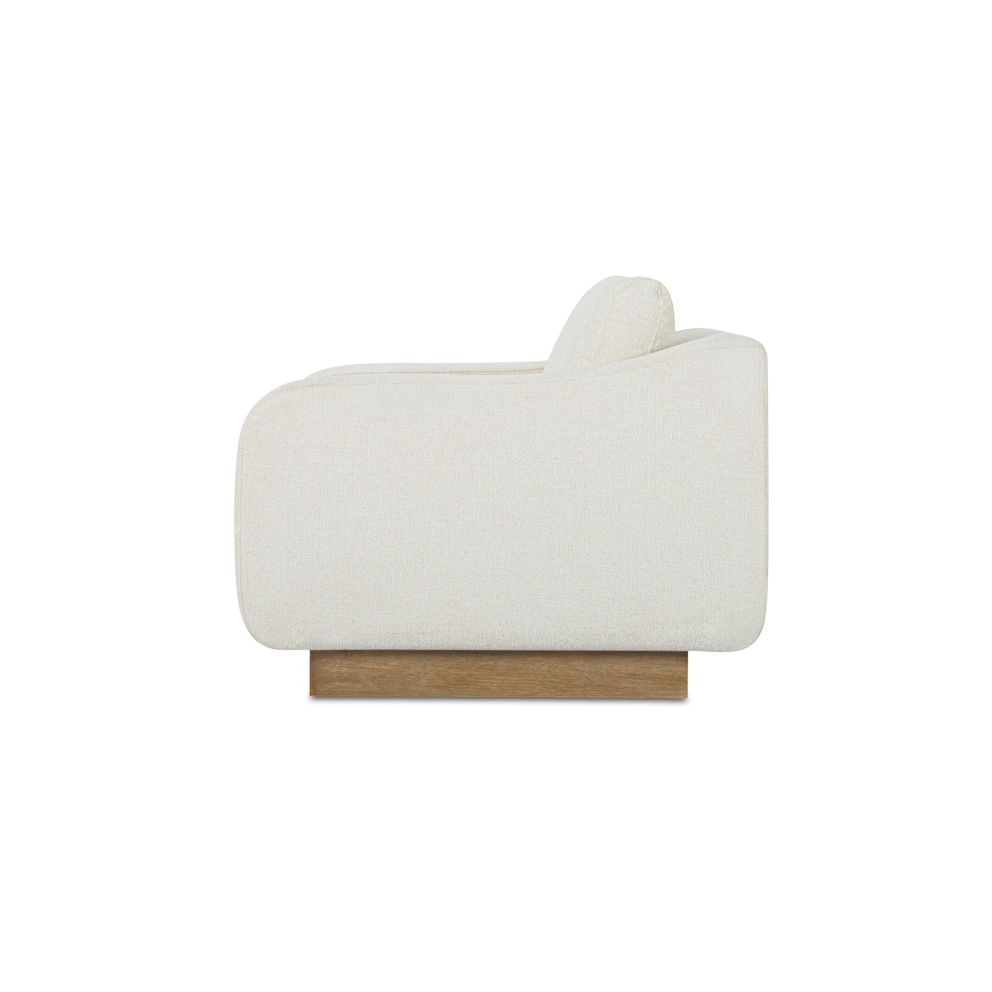 The Keane lounge chair's oversized silhouette invites serene repose, with gentle slopes and soft curves cradling the body. An elevated rubber wood plinth base is enhanced by wire brush finishing, while the plush back cushion promises enduring comfort.