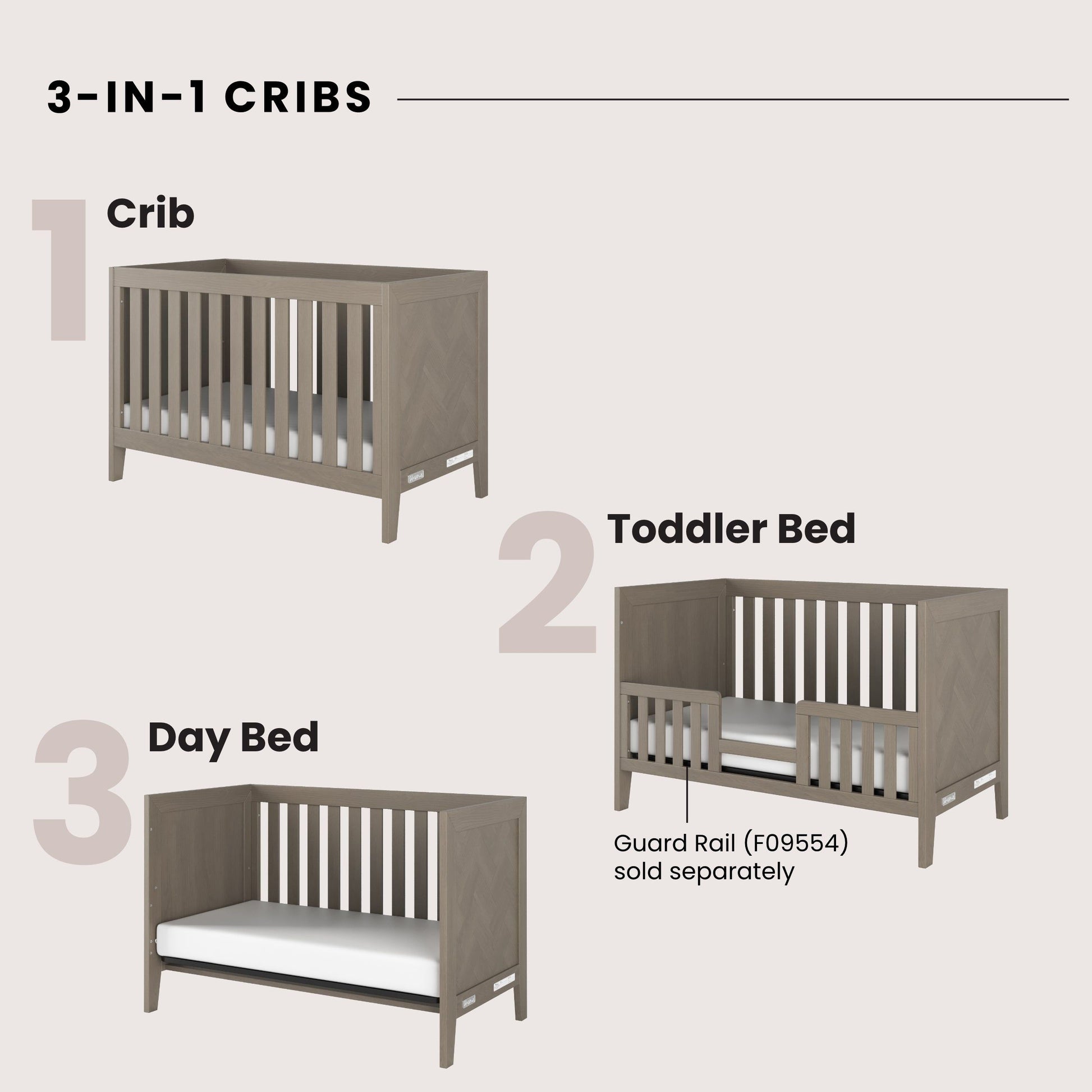 - 3-in-1 convertible crib grows with your child, converting to a toddler bed and daybed